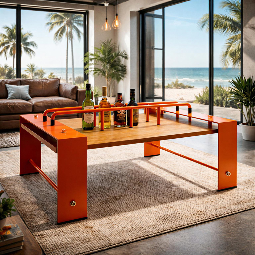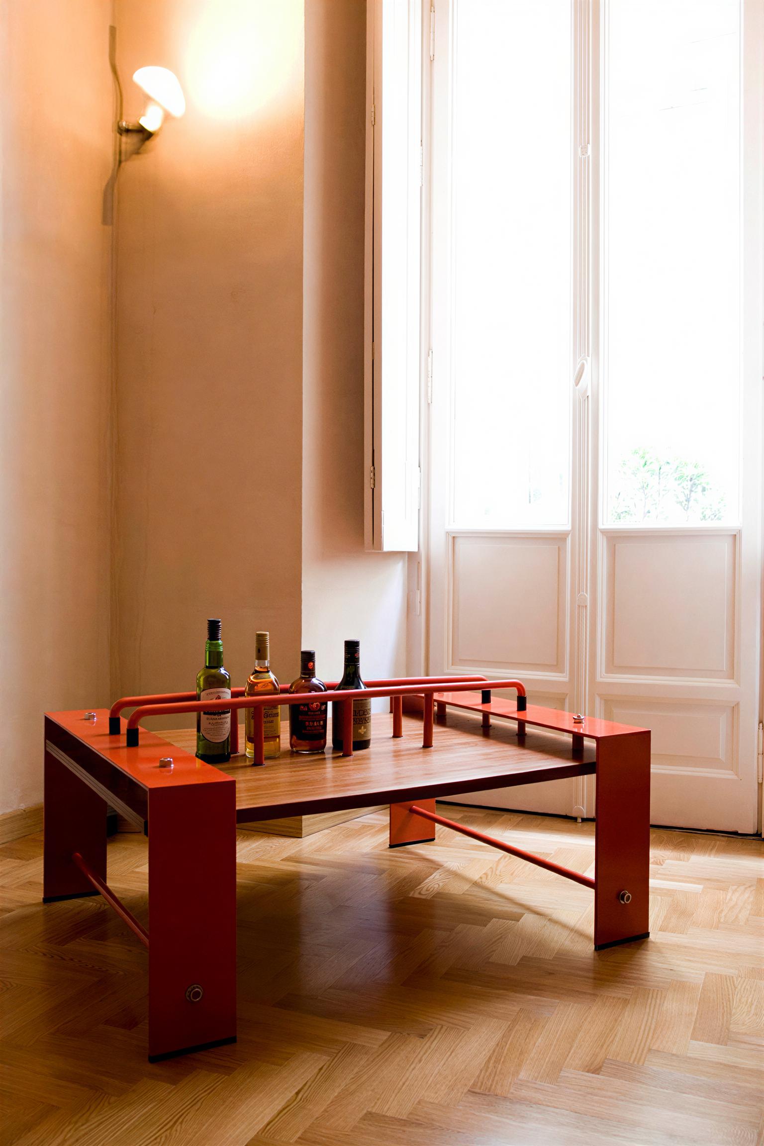 Table basse avec structure tubulaire et plateau en métal peint. Plateau en bois à lattes. Finition cire d'abeille 100 % naturelle.