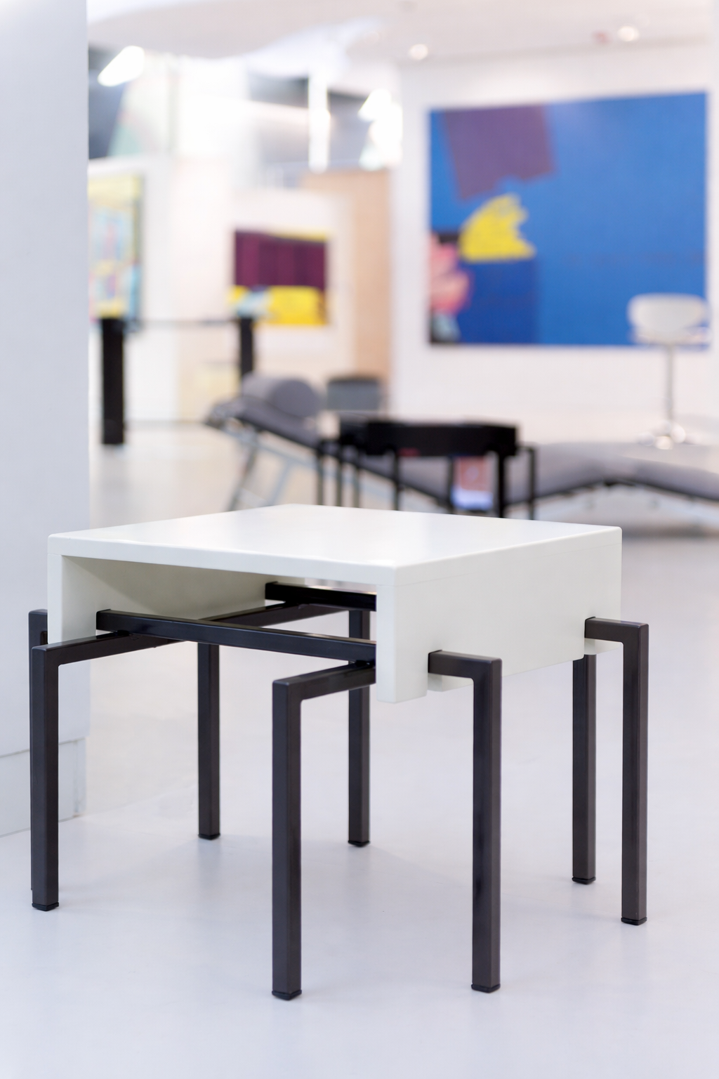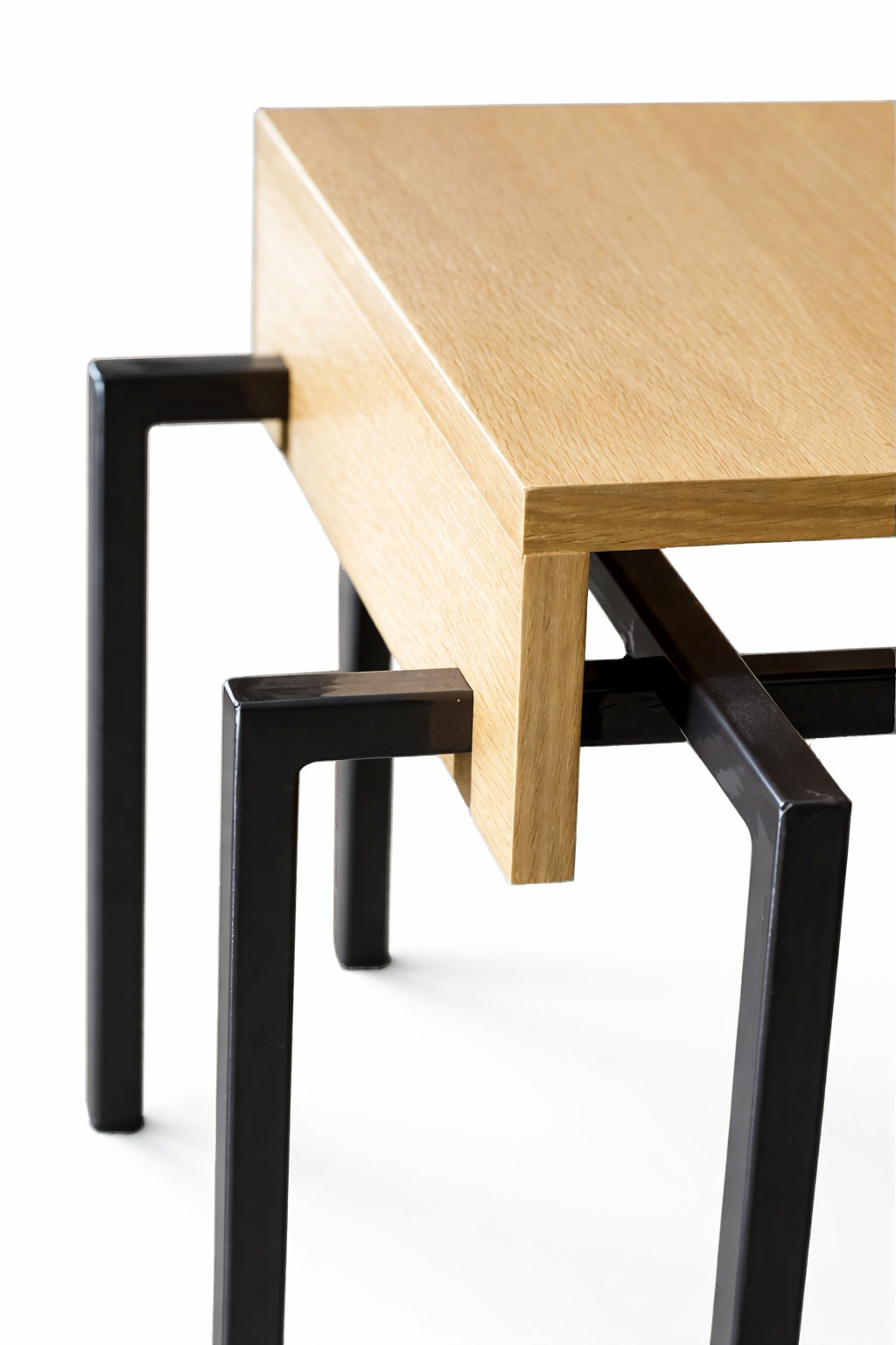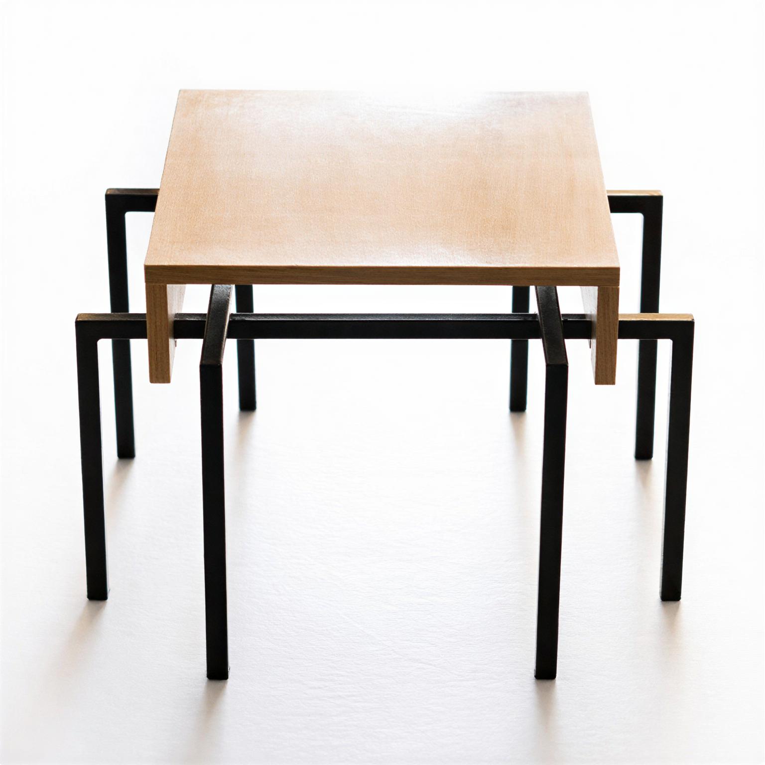 Table basse avec plateau en métal peint et structure tubulaire. Plateau en lattes de bois finition cire d'abeille 100 % naturelle.