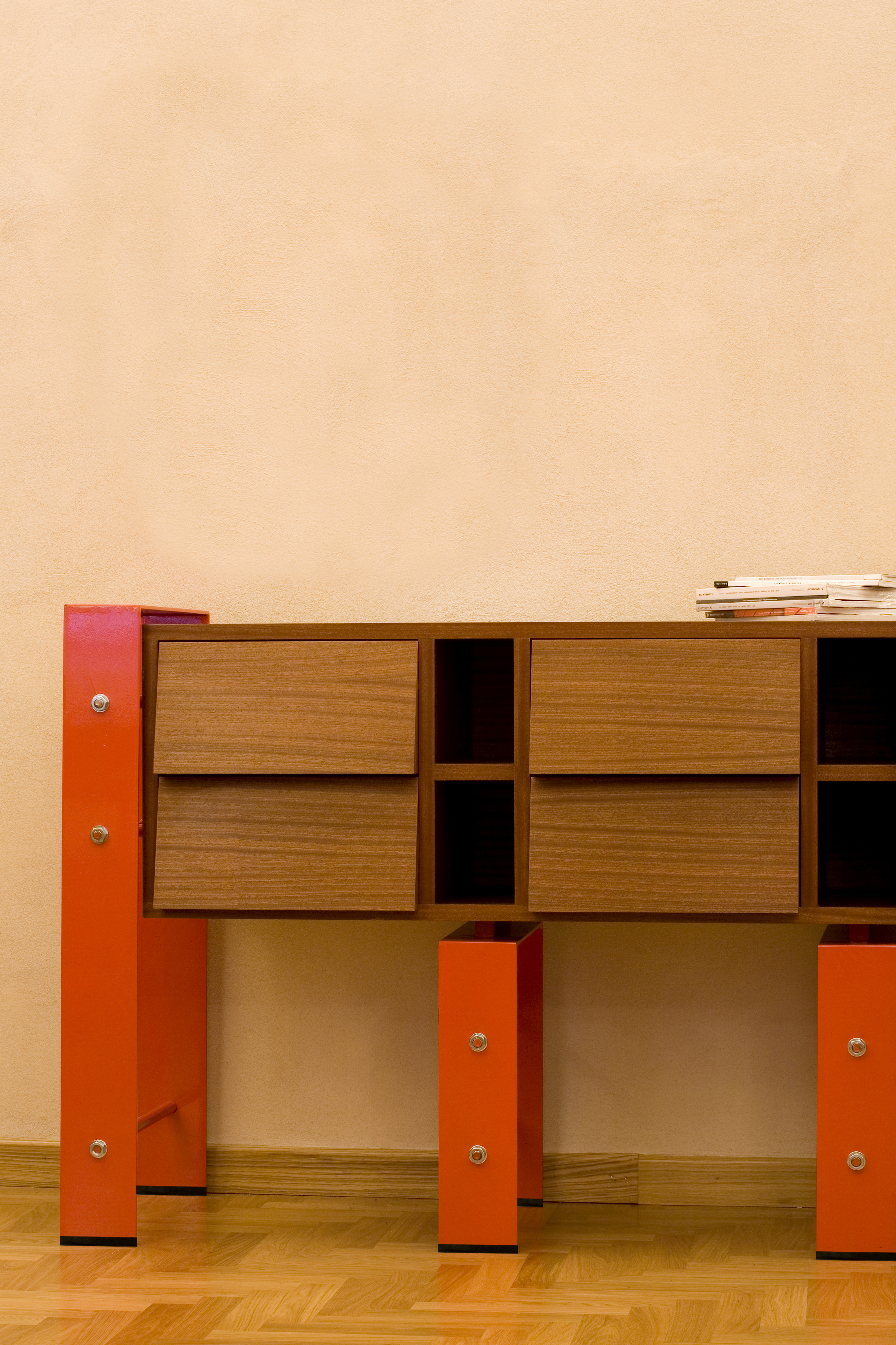 Commode à 6 tiroirs avec structure tubulaire et plateau métallique. Meuble compact en panneaux de particules. Finition cire d'abeille 100 % naturelle.