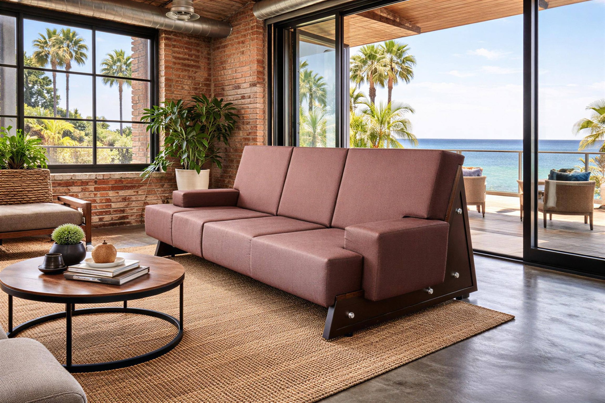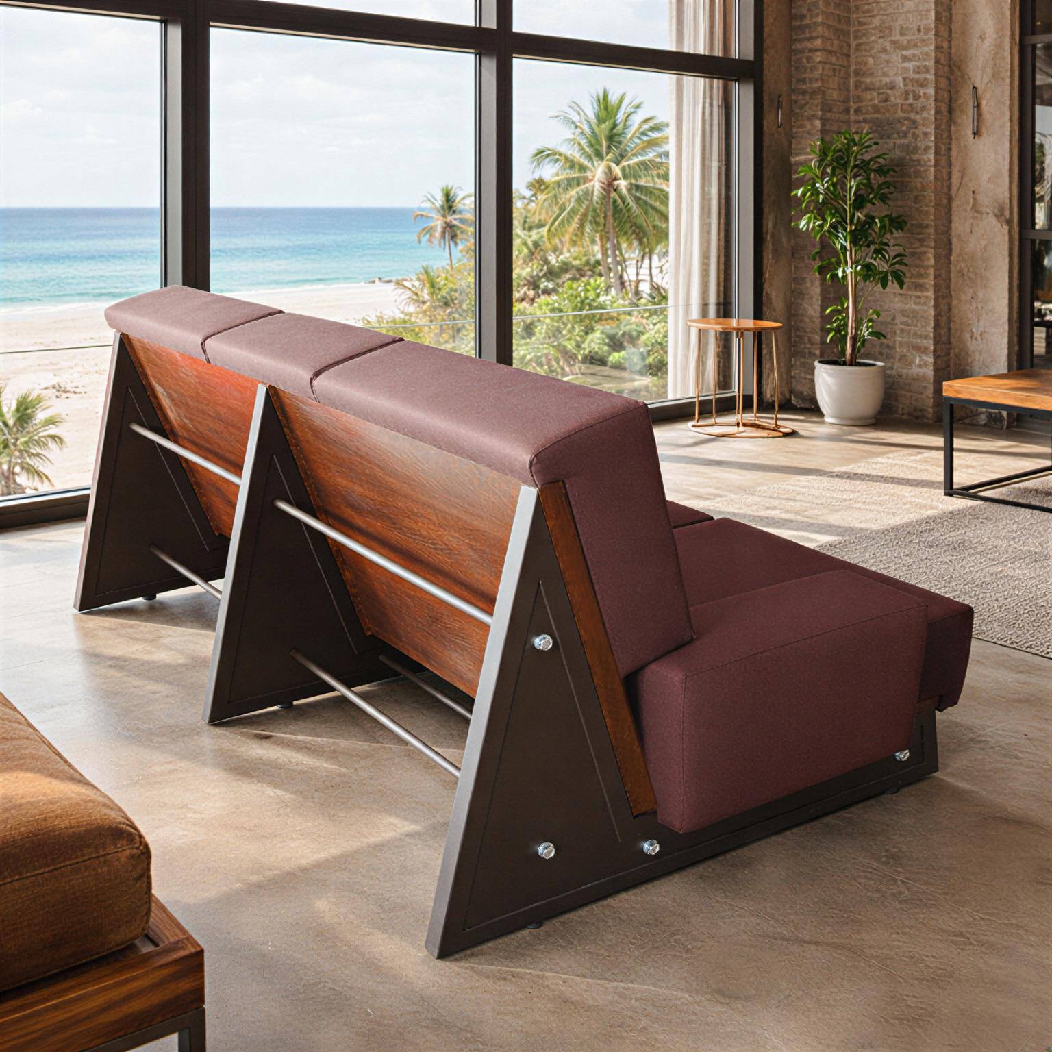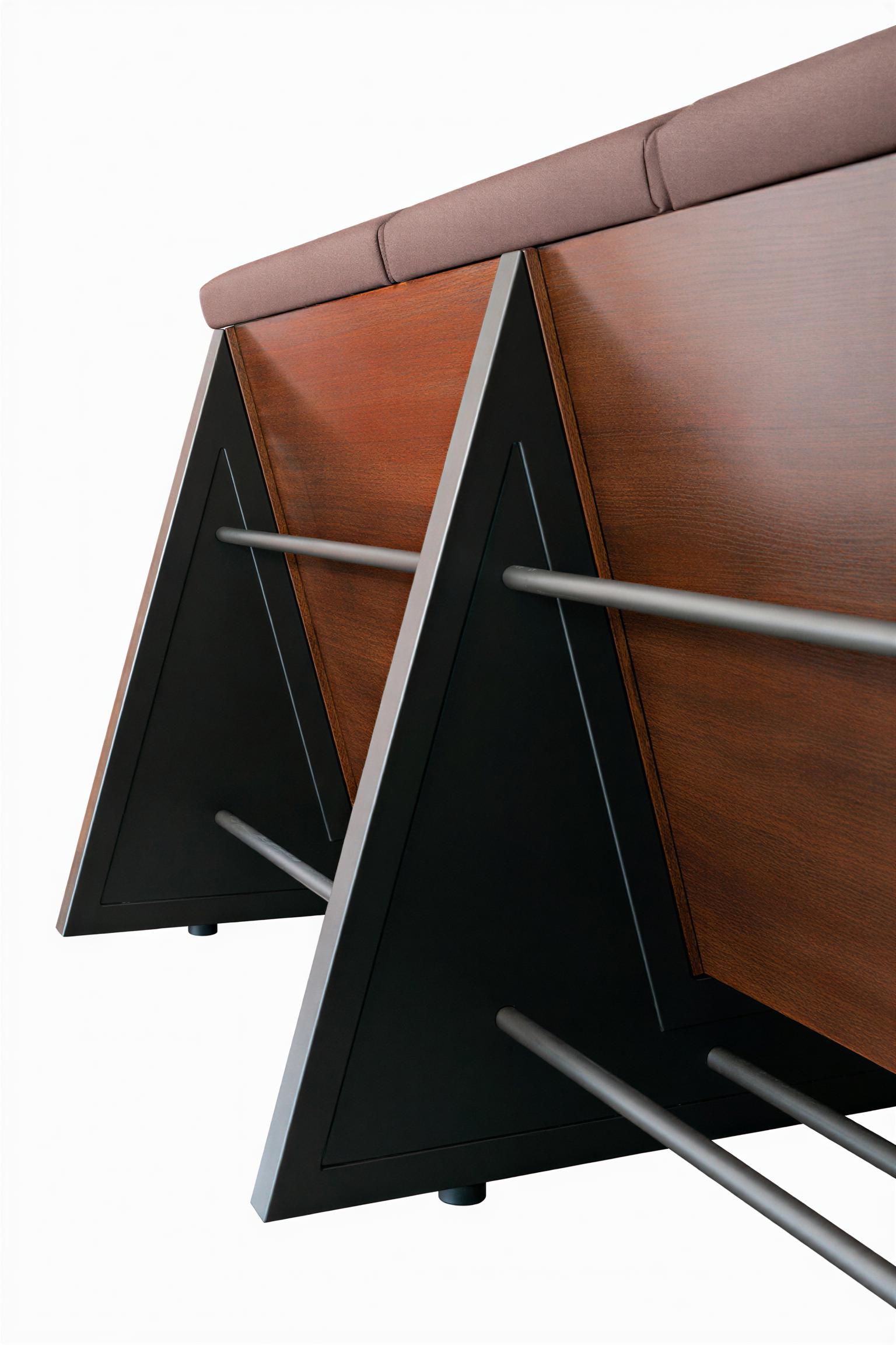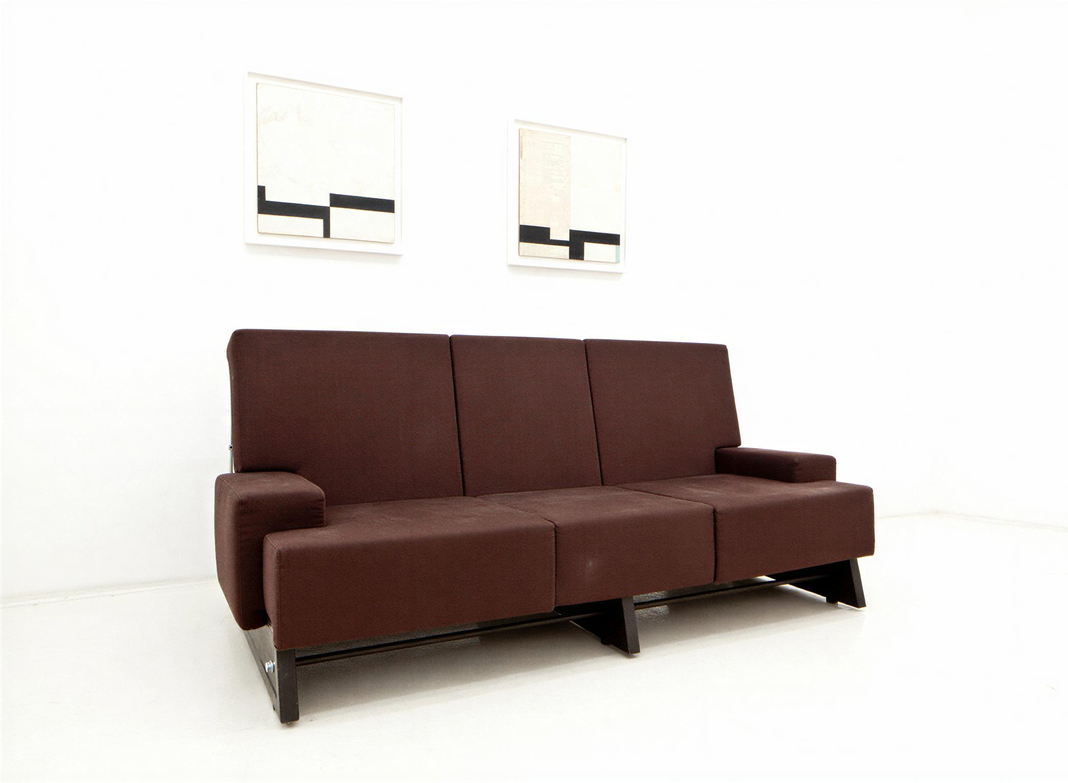 Canapé trois places avec structure tubulaire en tôle d'acier peinte et boulons apparents. Finition panneaux de bois. Coussins en mousse de polyuréthane souple recouverts de tissu marron.