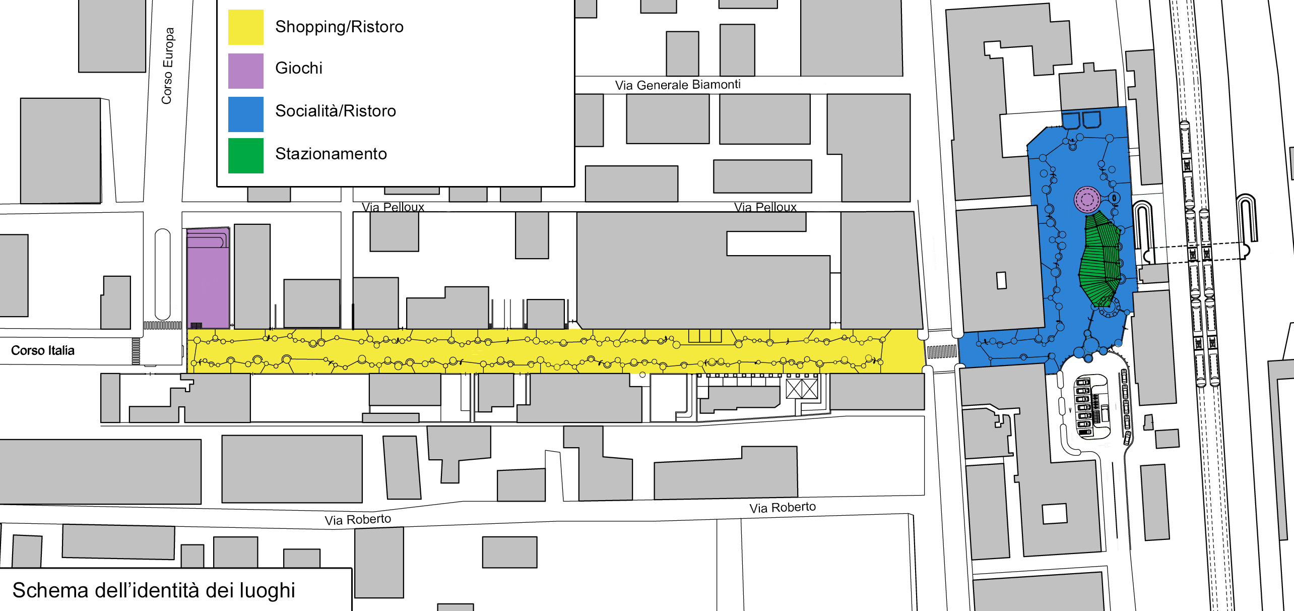 Corso Italia: via ampia e facilmente percorribile, con marciapiedi e negozi distribuiti lungo tutta la sua lunghezza. Le aiuole esistenti separano l’area pedonale da quella carrabile. Gli edifici variano tra facciate in pseudo-Art Nouveau e costruzioni più recenti, di minor pregio. La pavimentazione alterna autobloccanti, mattoni in cotto e vecchie piastrelle. Numerosi vialetti conducono ai garage sotterranei. L’insieme crea un “disordine urbano” percepibile.