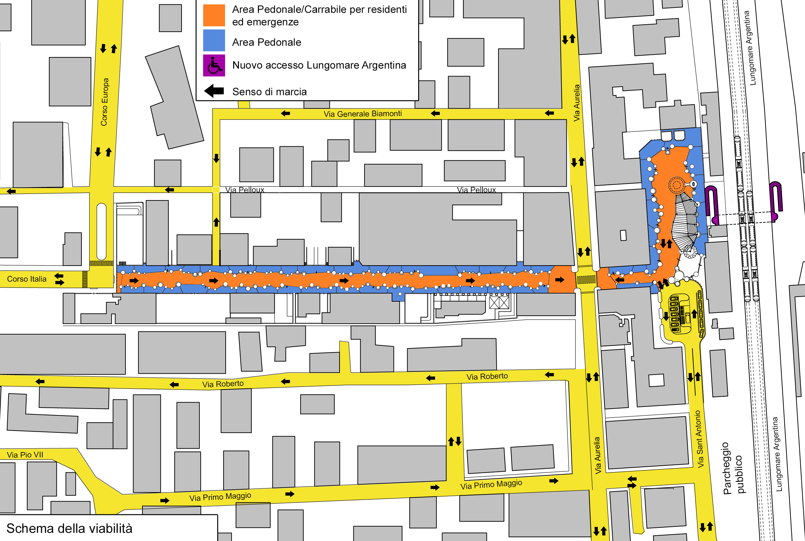 Pedonalizzazione di Corso Italia e della piazza, integrando anche l’area della stazione ferroviaria.