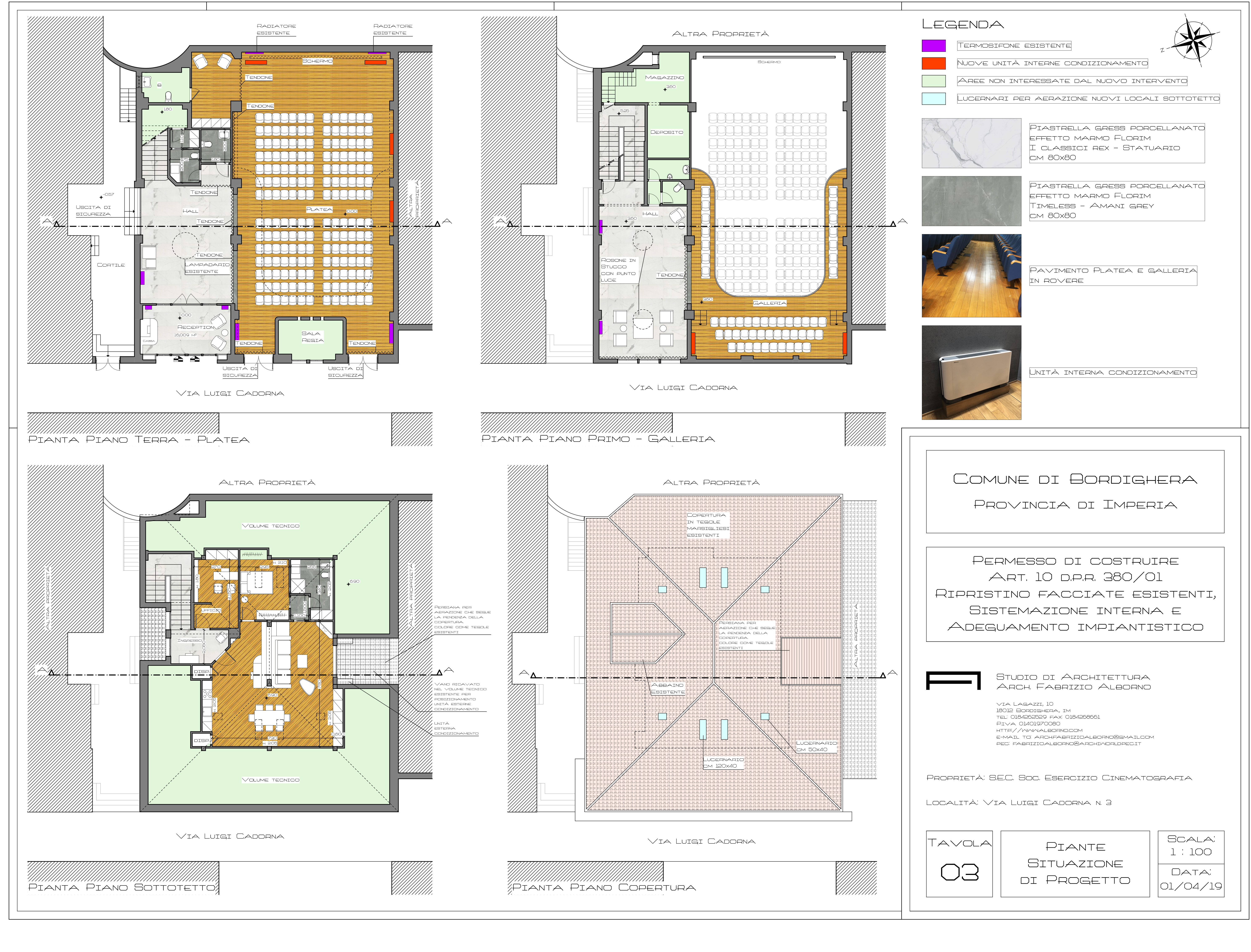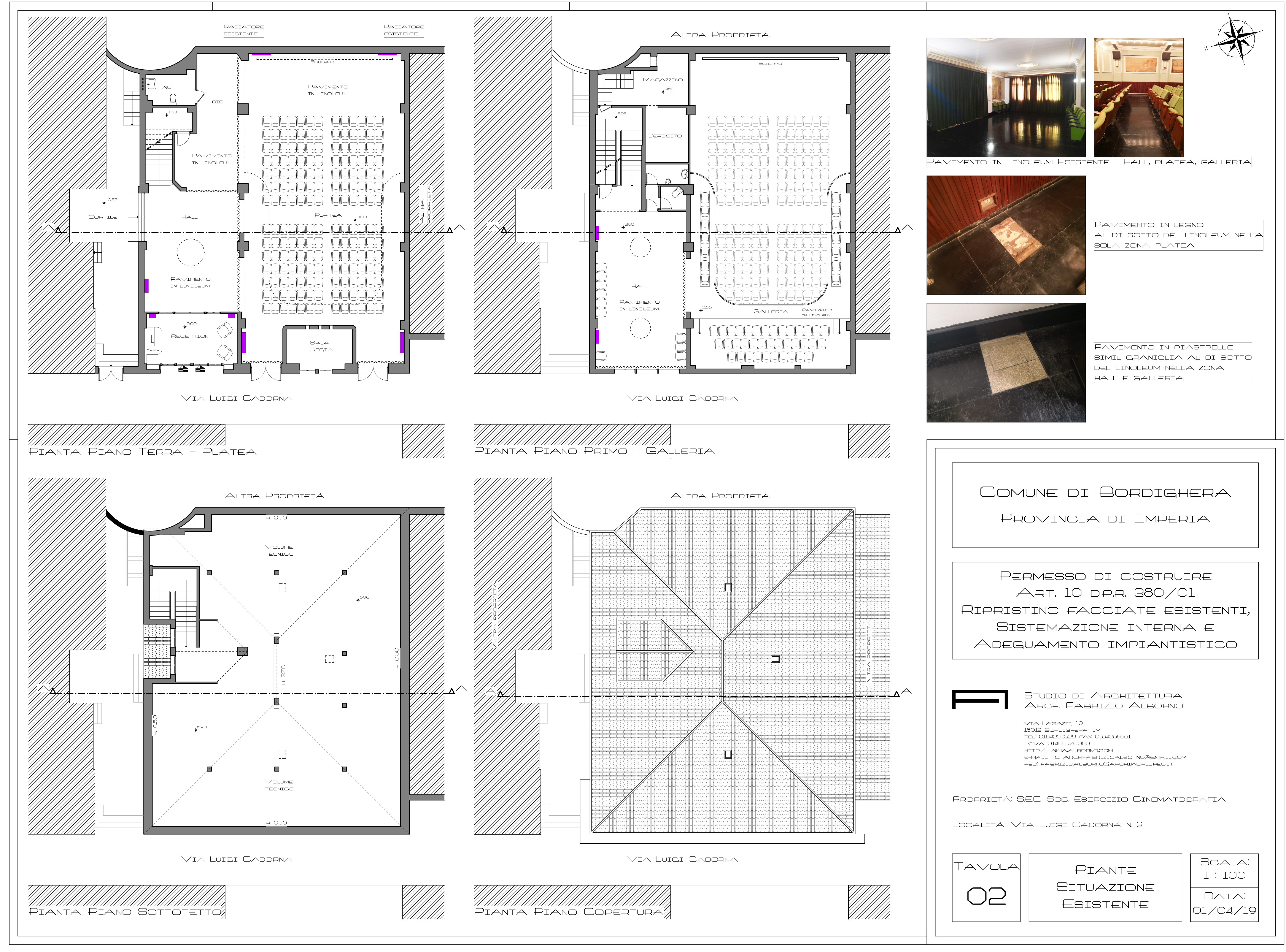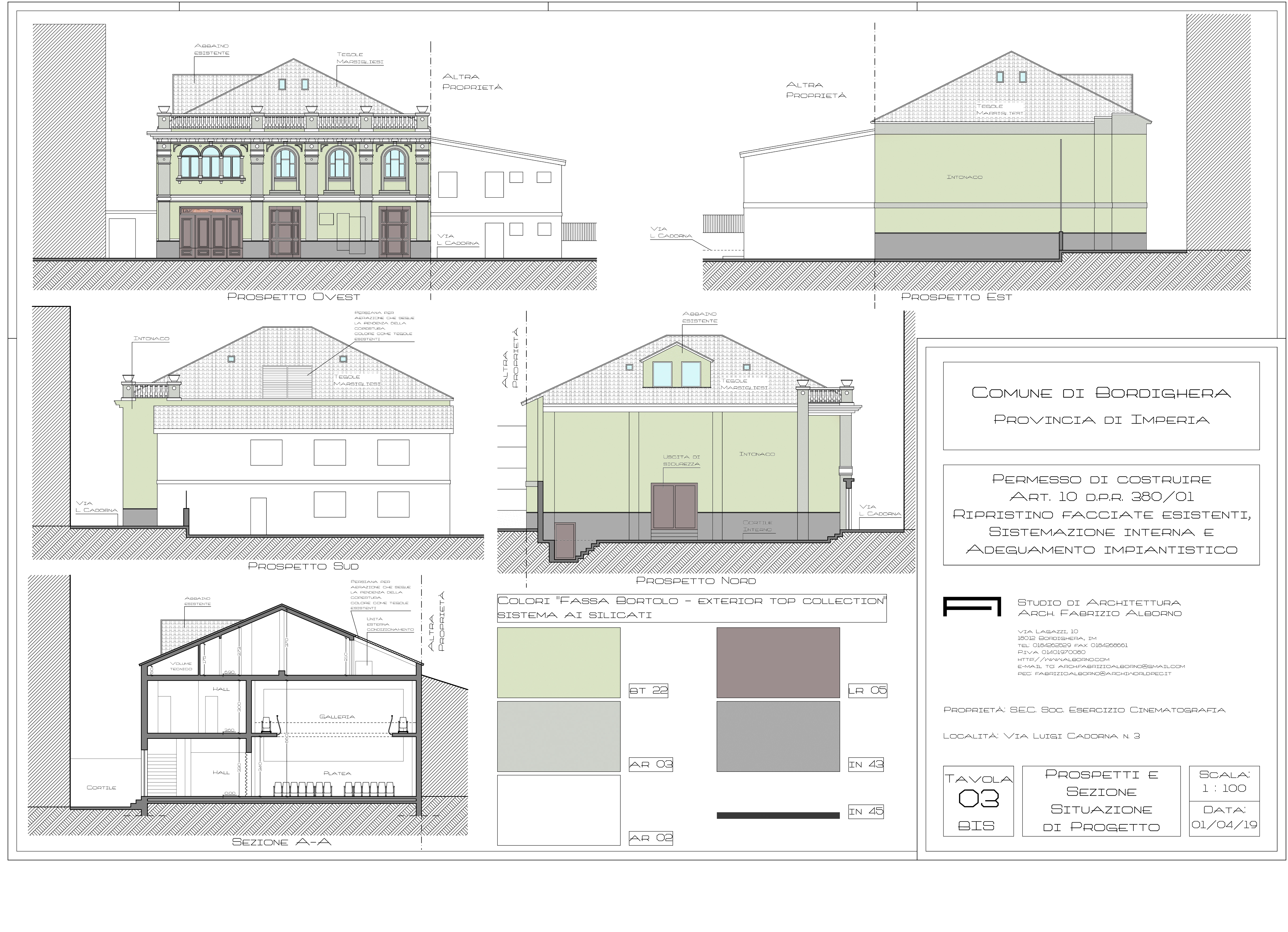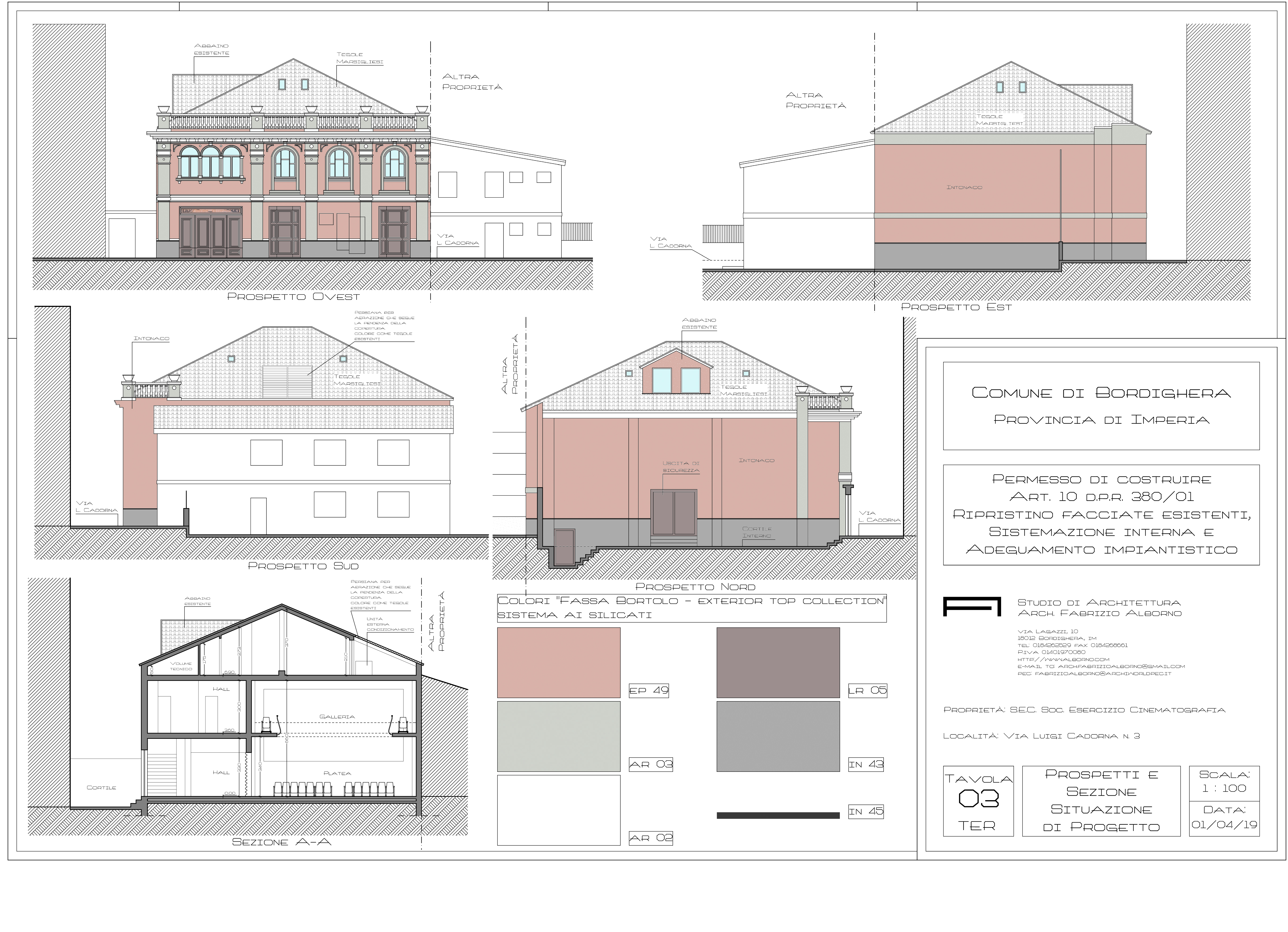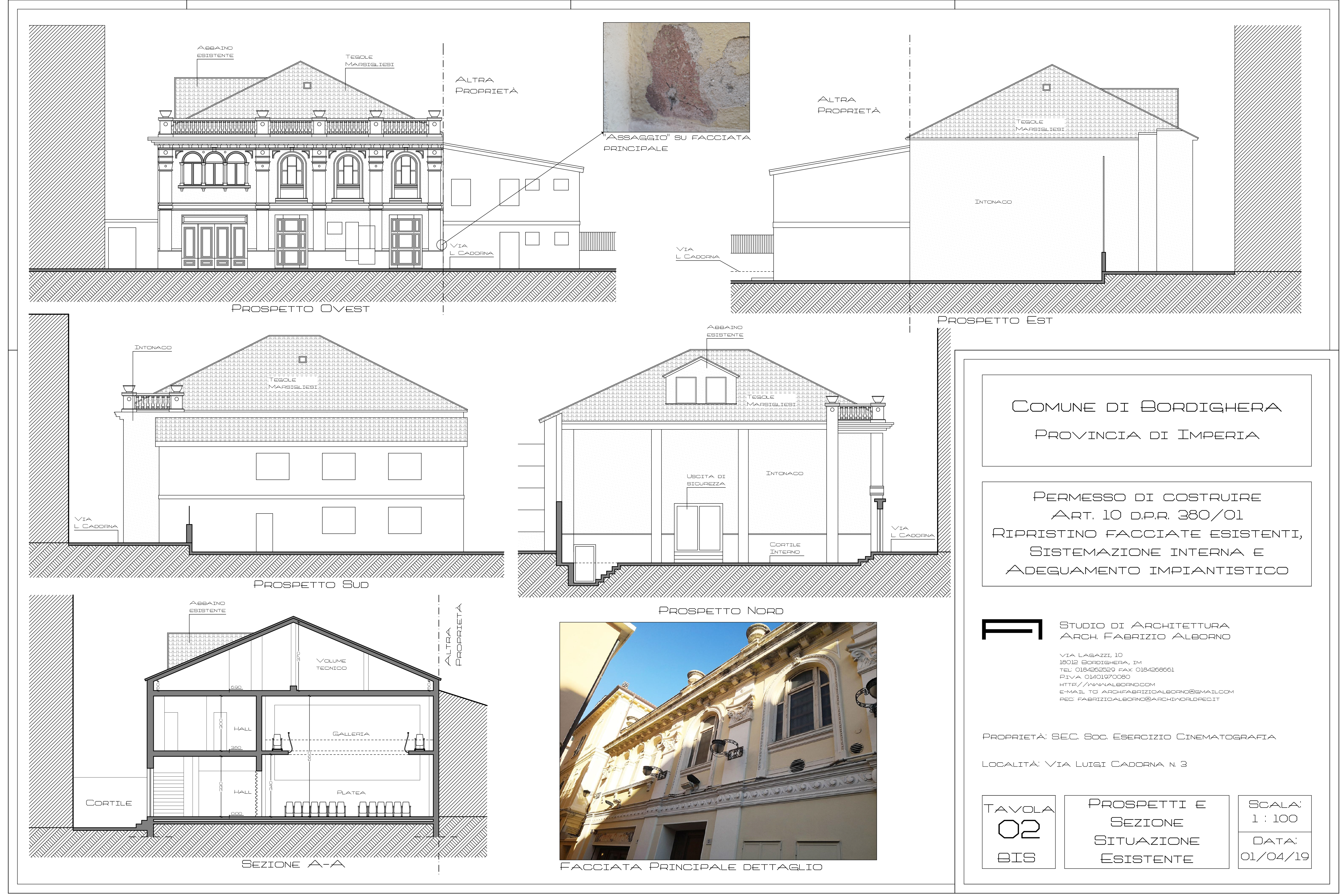 Il progetto riguarda la ristrutturazione dell’edificio denominato "Cinema Olimpia", situato nel Comune di Bordighera, in Via Cadorna. L’immobile è tutelato ai sensi della Legge n. 1089/39 in quanto di interesse storico-artistico.