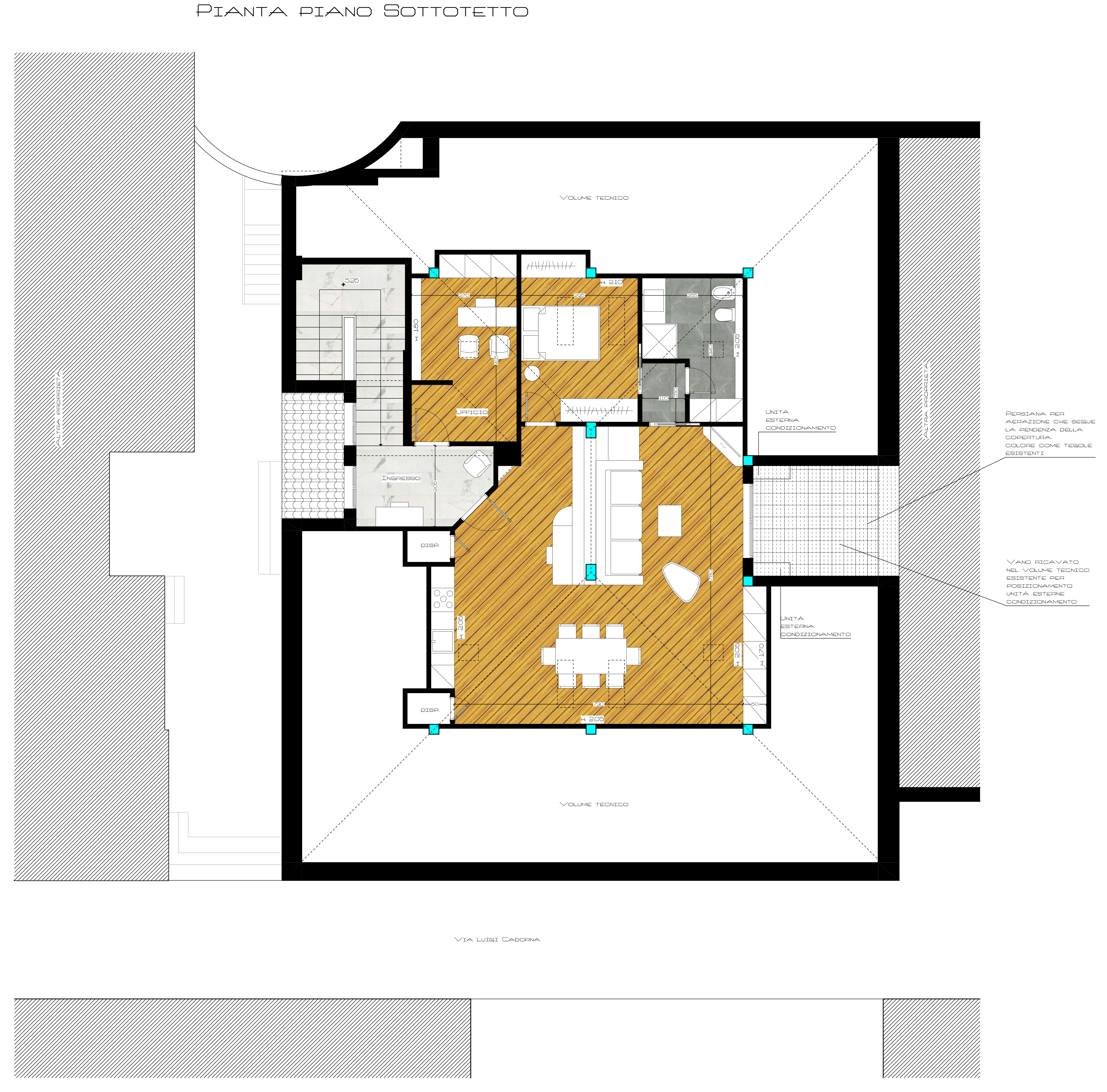 Recupero del sottotetto mediante cambio di destinazione d’uso, per creare ufficio per l’attività cinematografica e un appartamento per il proprietario, con isolamento del tetto, nuove partizioni e impianti.