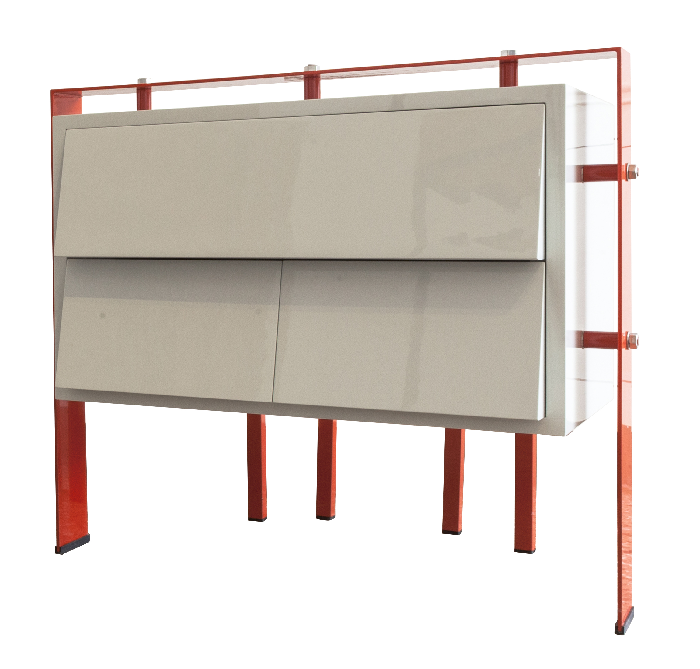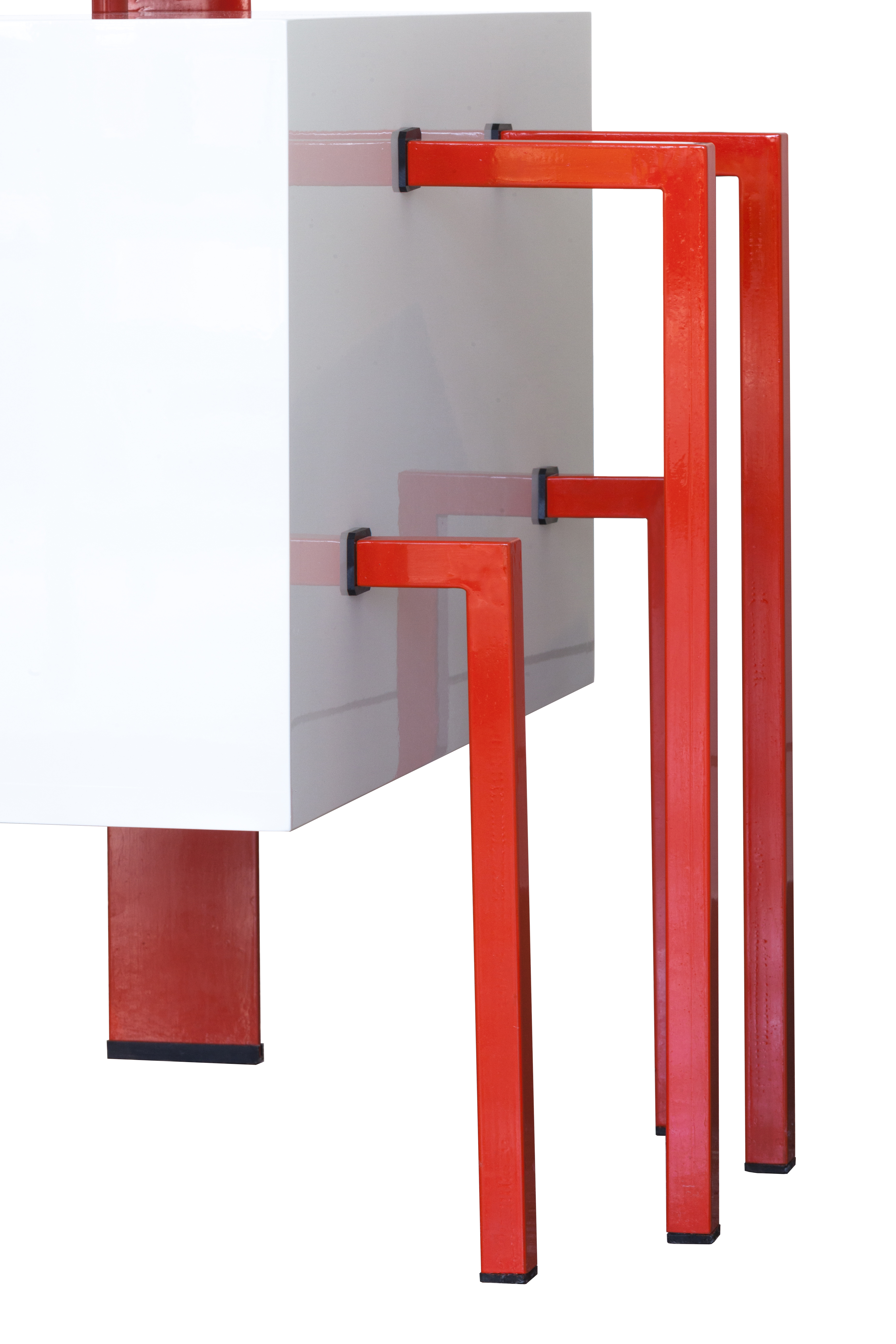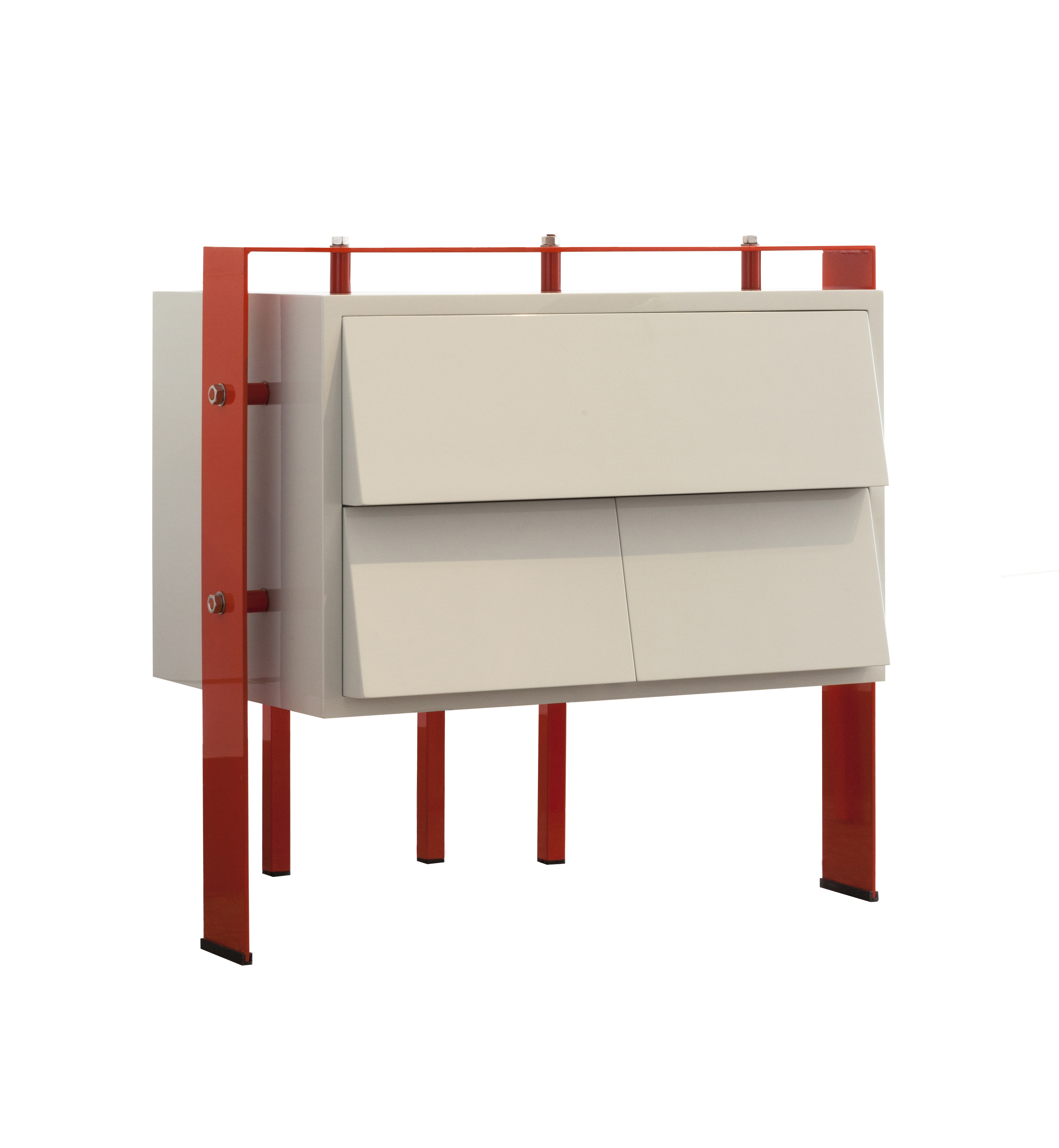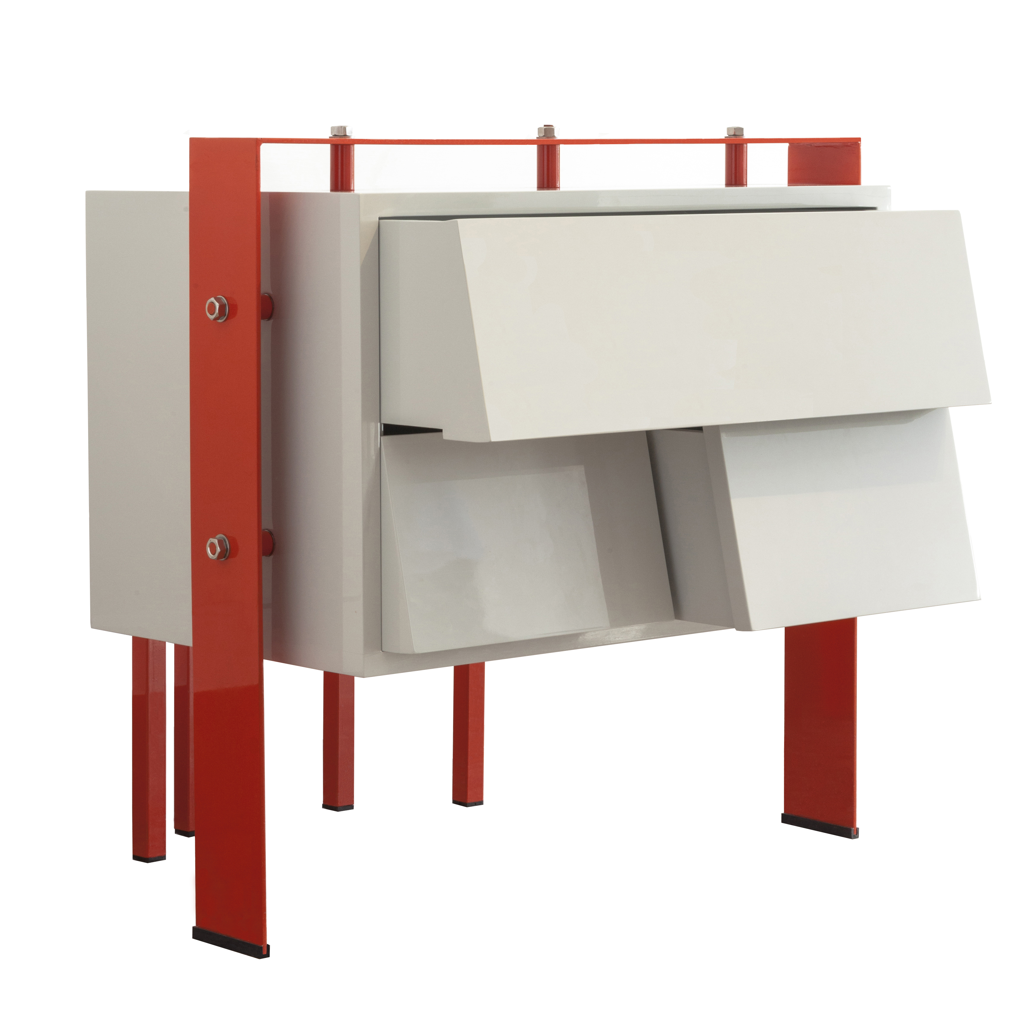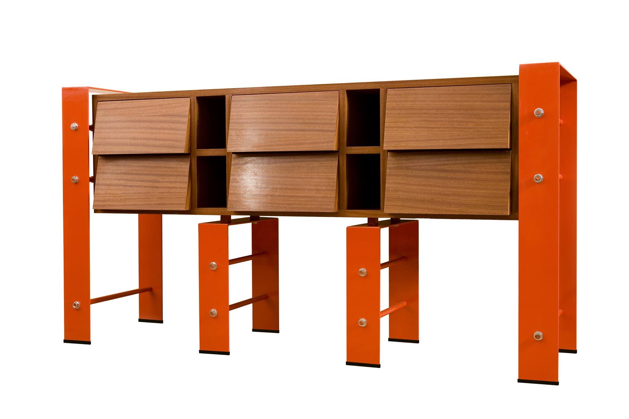 Three-drawer chest of drawers with a painted metal plate and tubular frame. Compact piece made of blockboard. 100% natural beeswax finish.