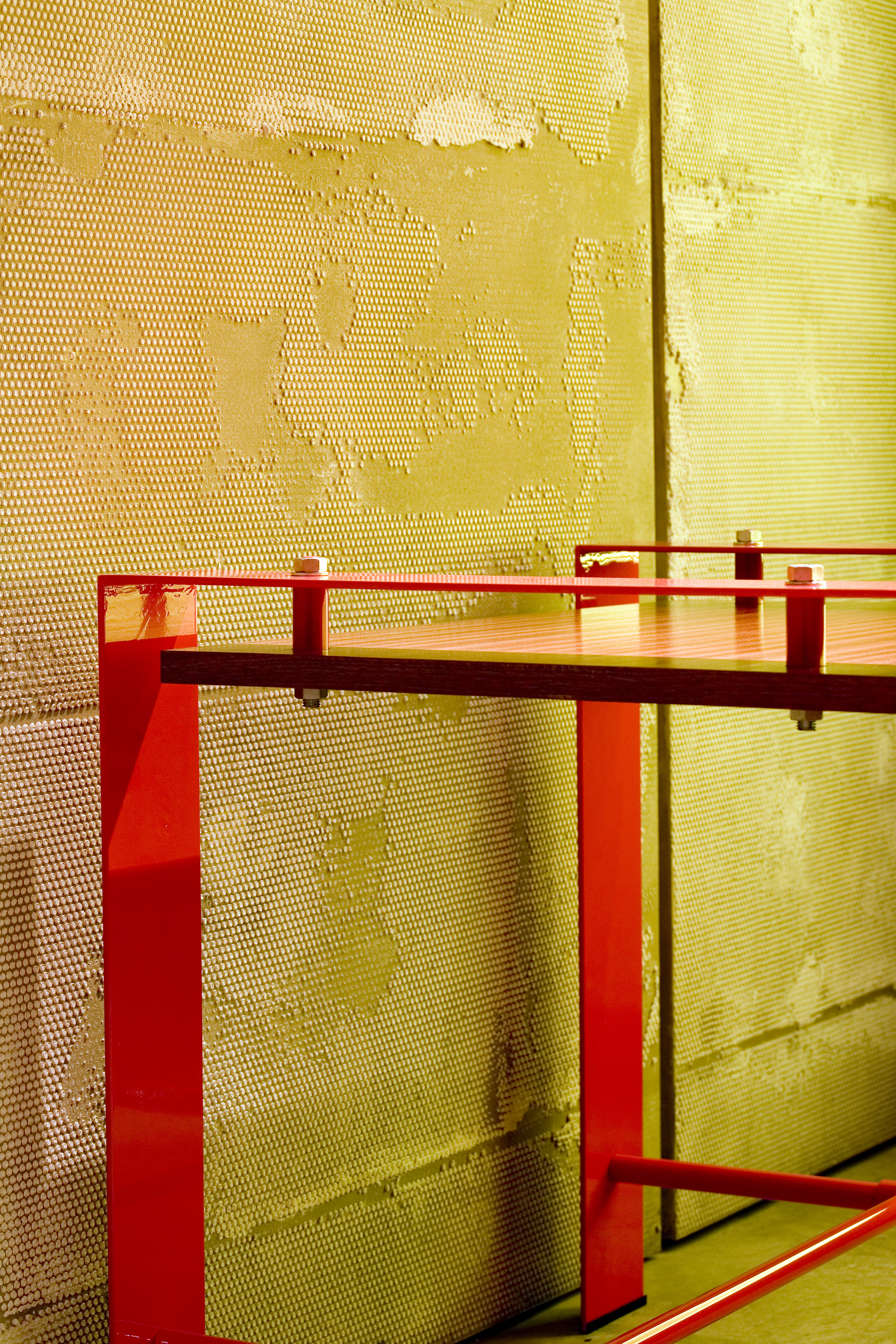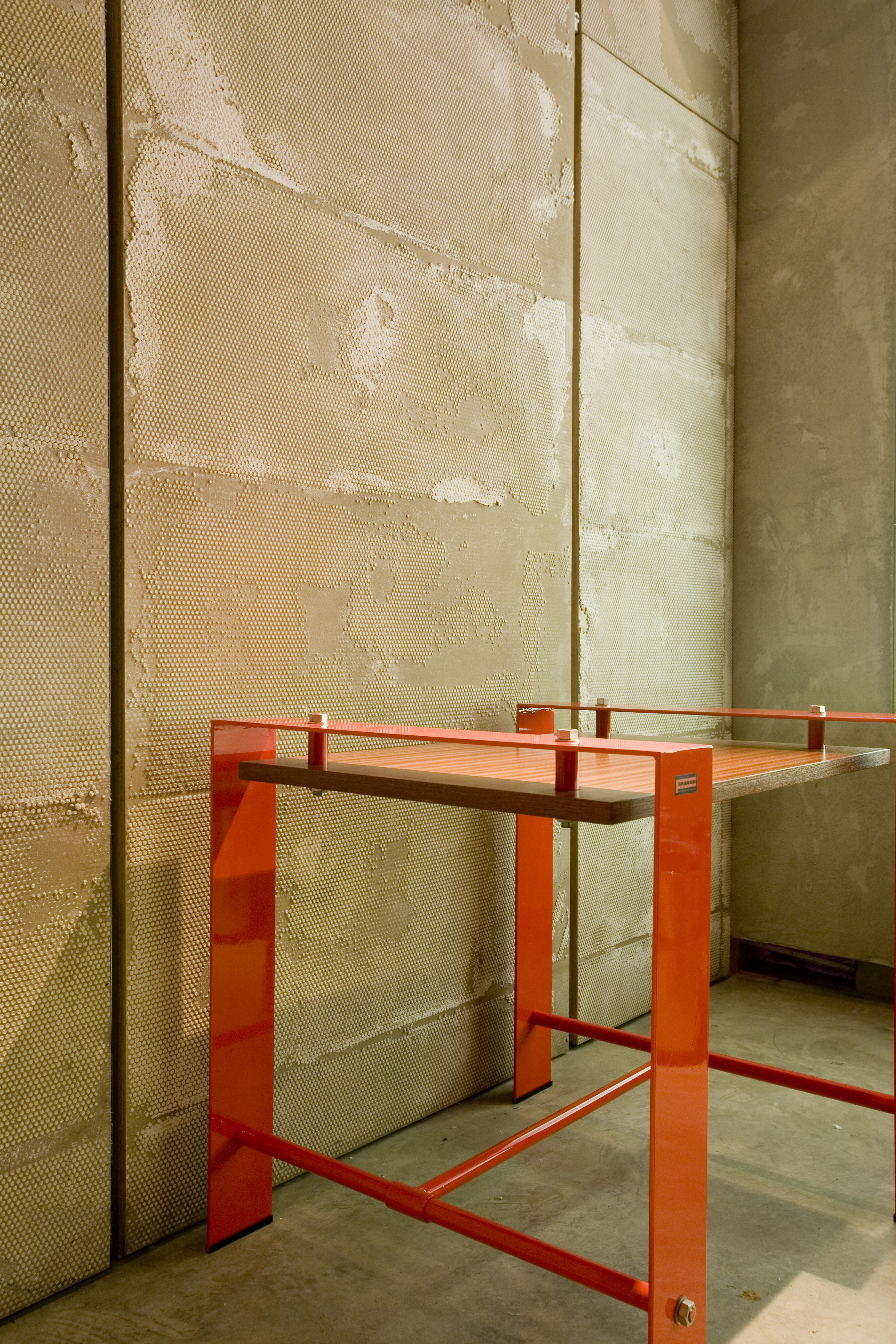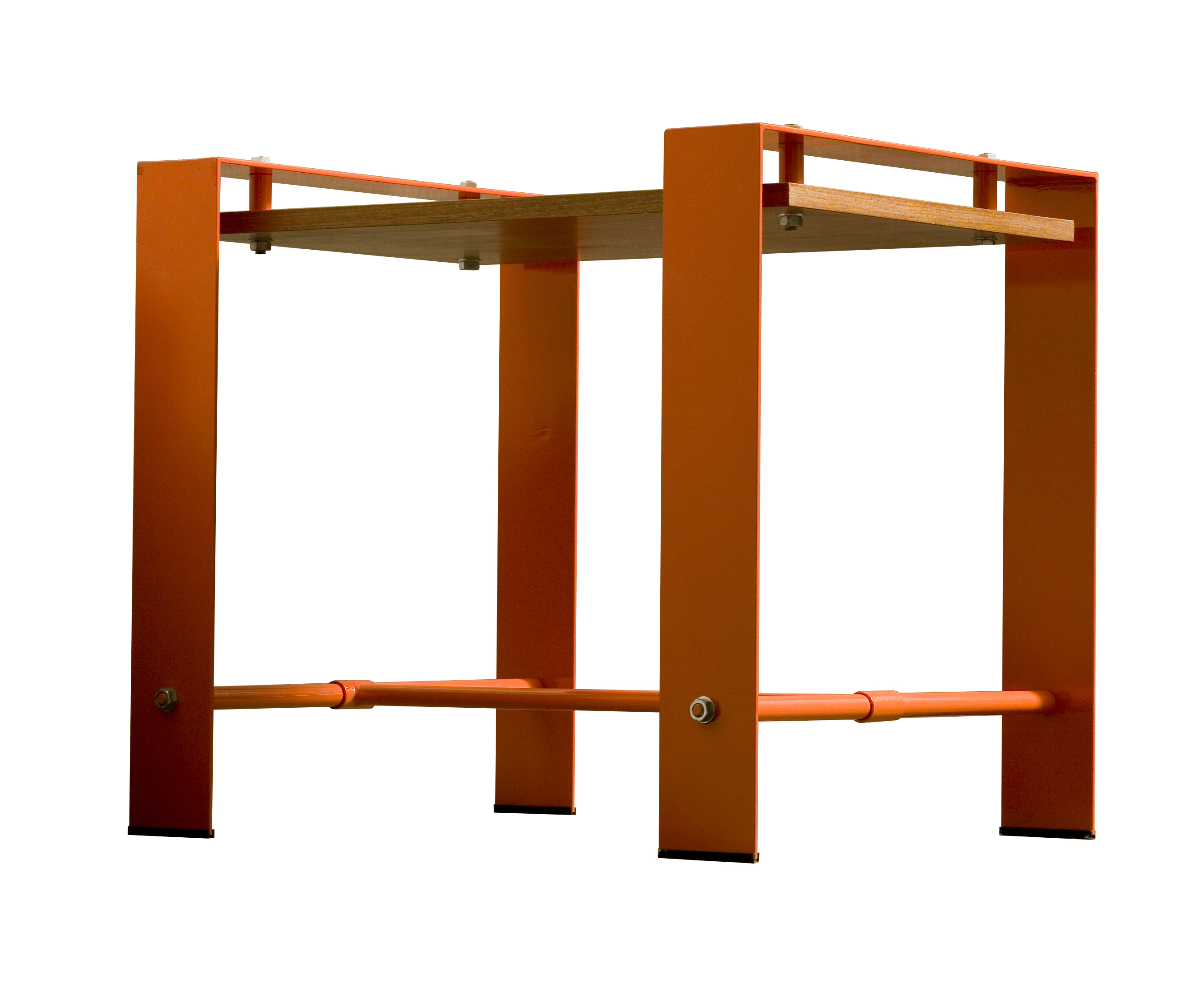Coffee table with painted metal plate and tubular frame. Slatted wood top. 100% natural beeswax finish.