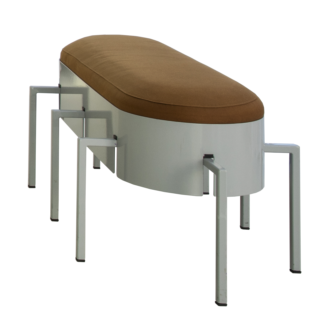 Bench with a supporting frame made of painted metal plate and tubular steel.