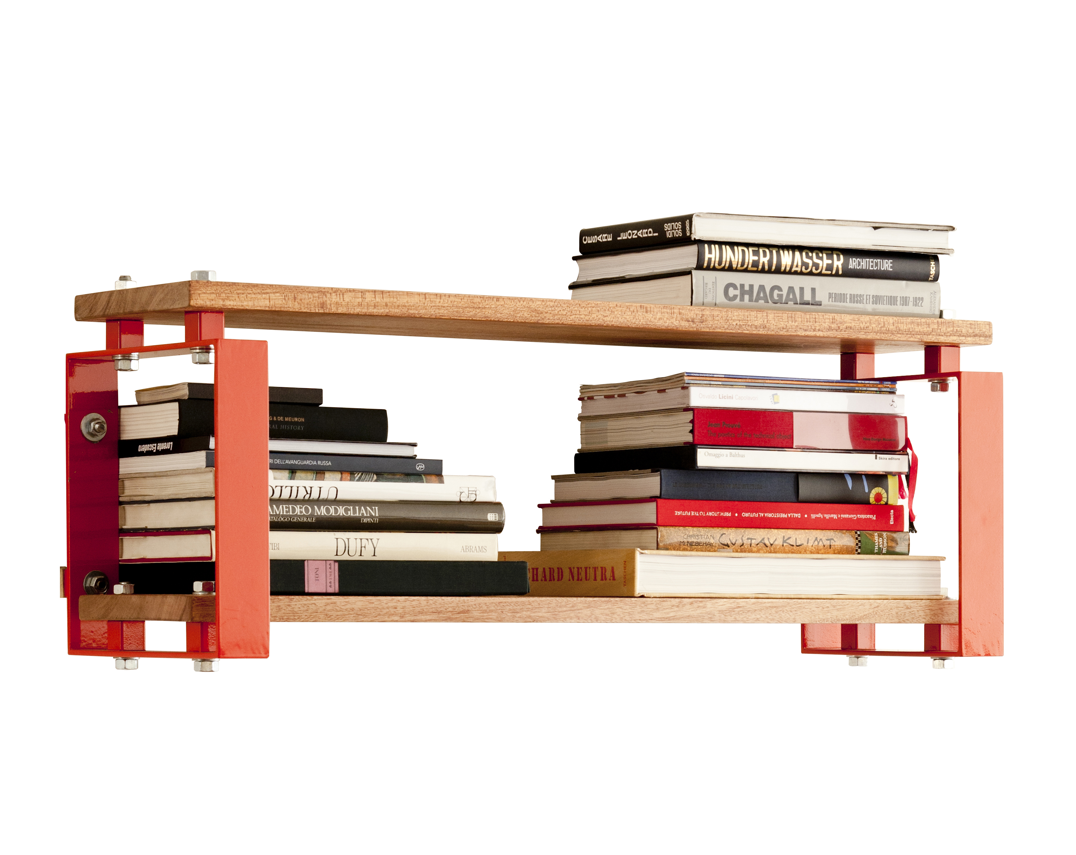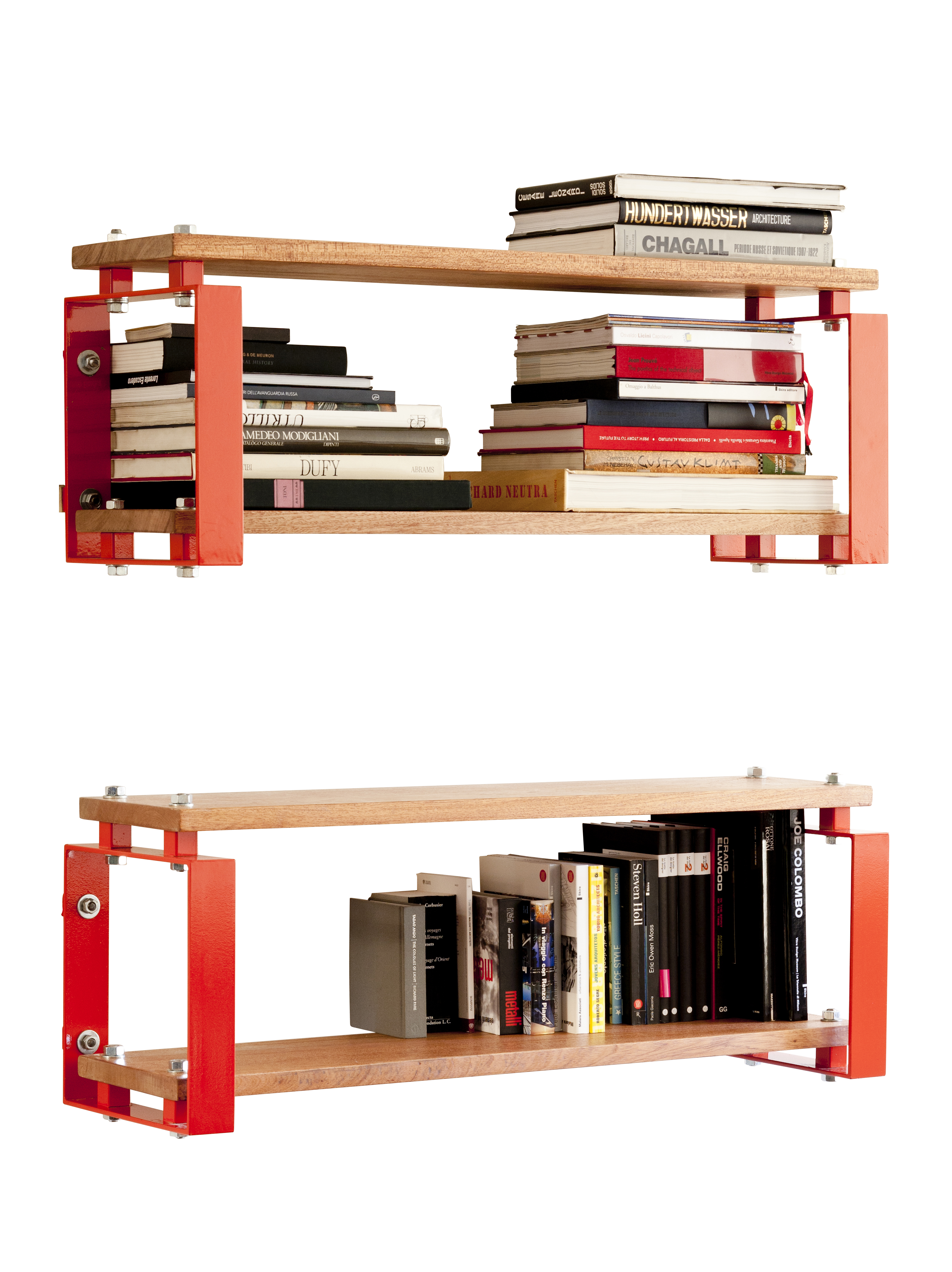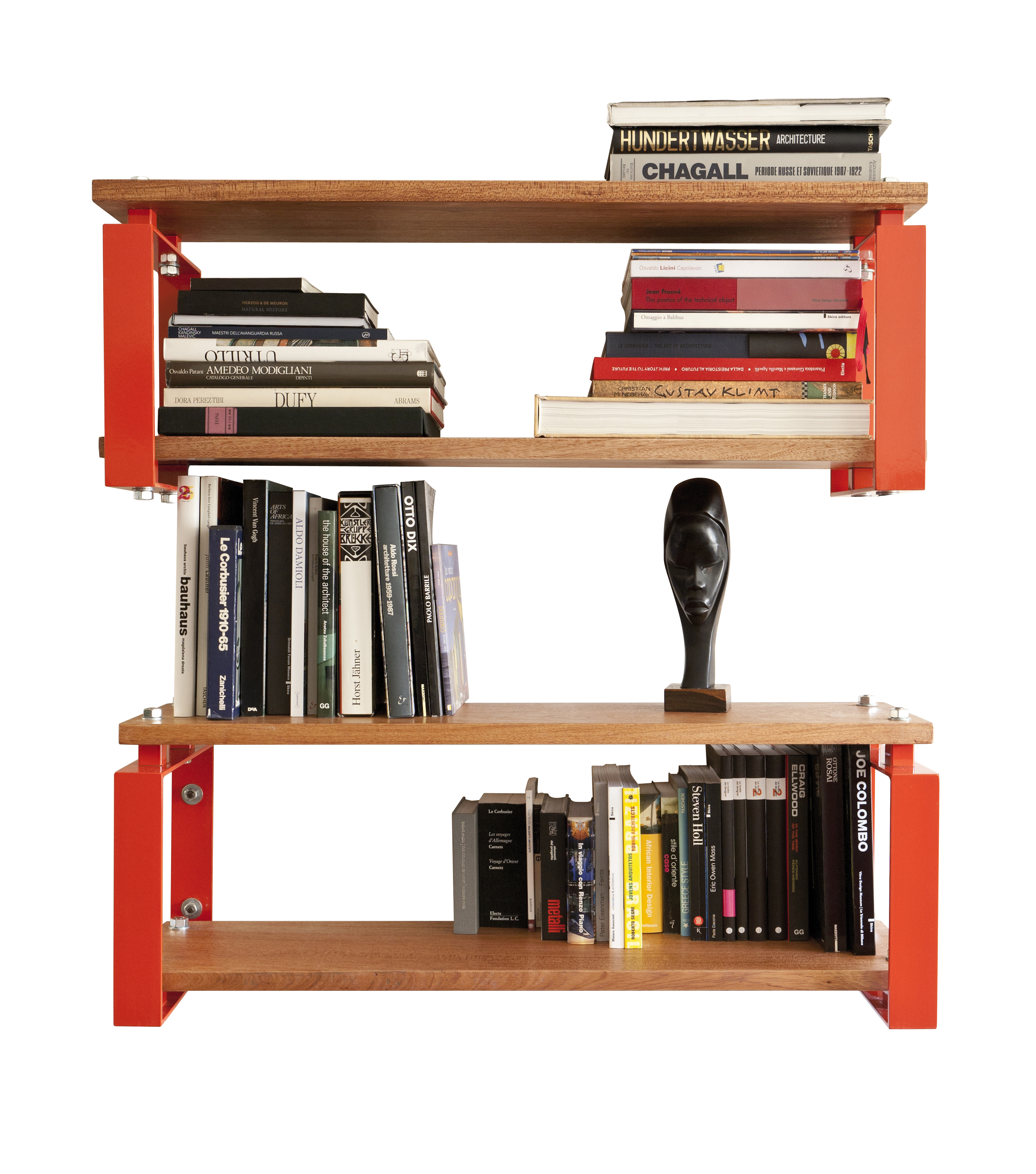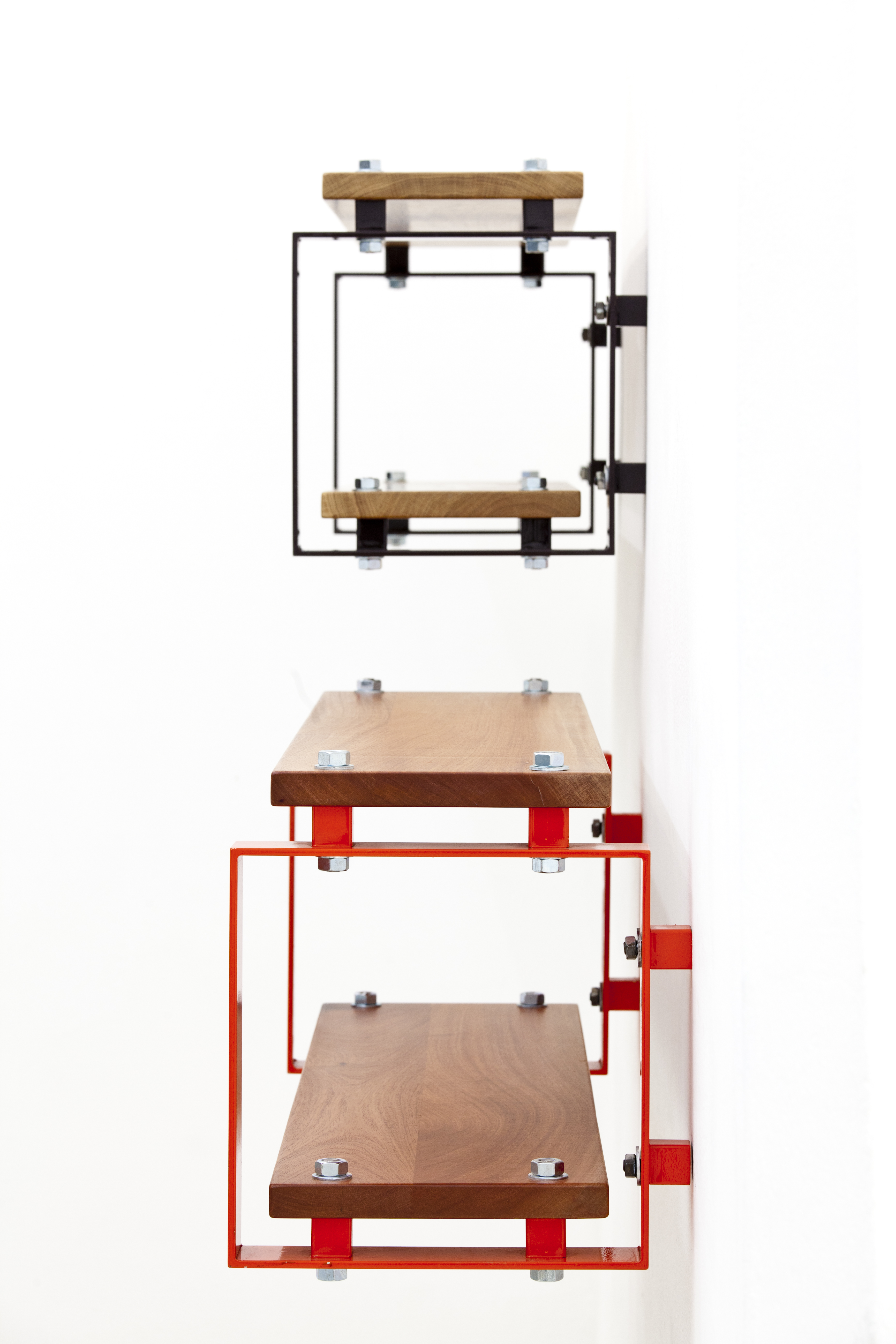 Modular shelf with painted metal frame and exposed bolts. Solid wood shelves with a natural wax finish.