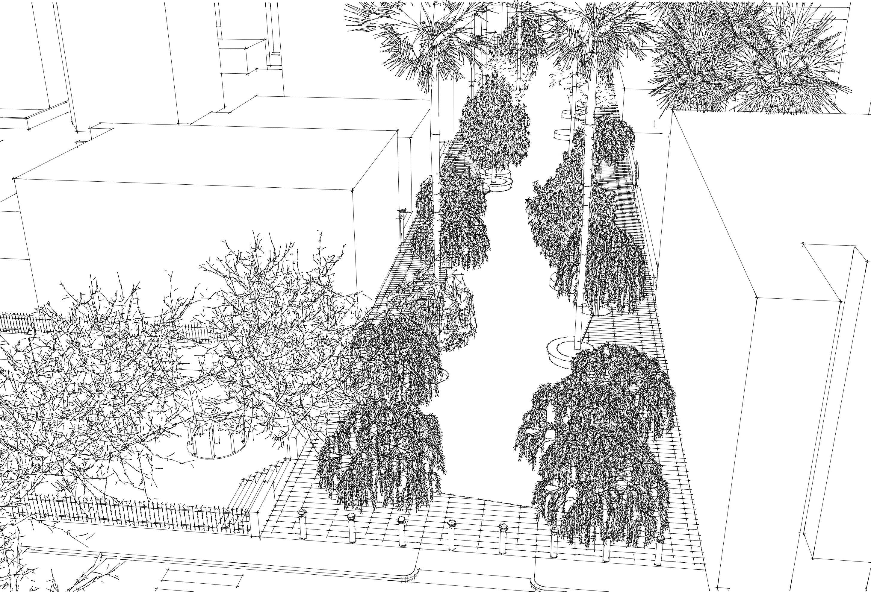 Introduzione di un impianto geometrico definito, capace di armonizzare gli elementi esistenti e ridurre il caos visivo.