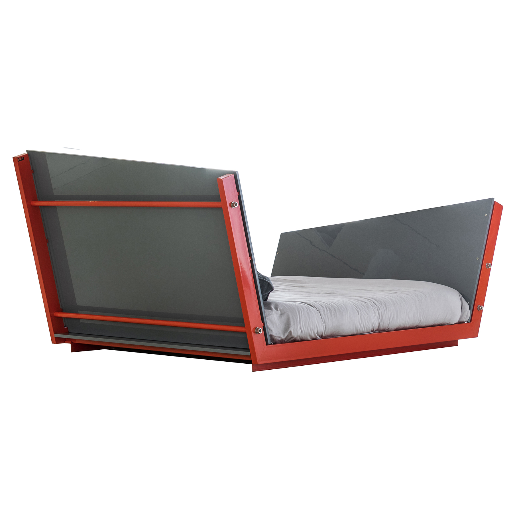 Letto con struttura portante in tubolare metallico verniciato. Pannelli in legno. Finitura con cera d'api 100% naturale o laccati.