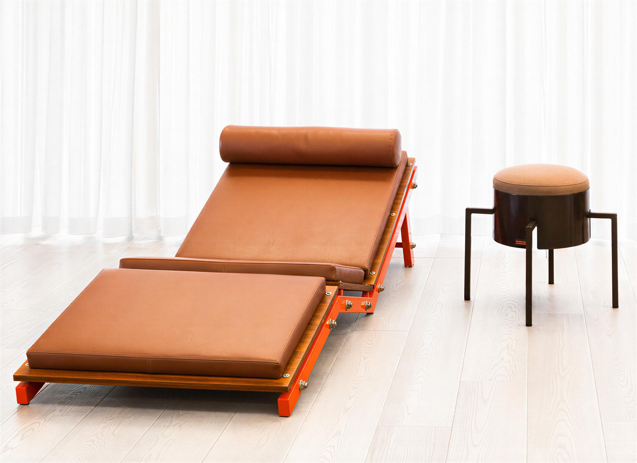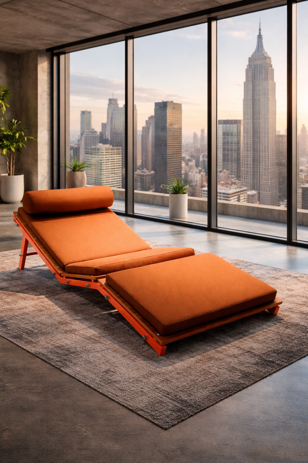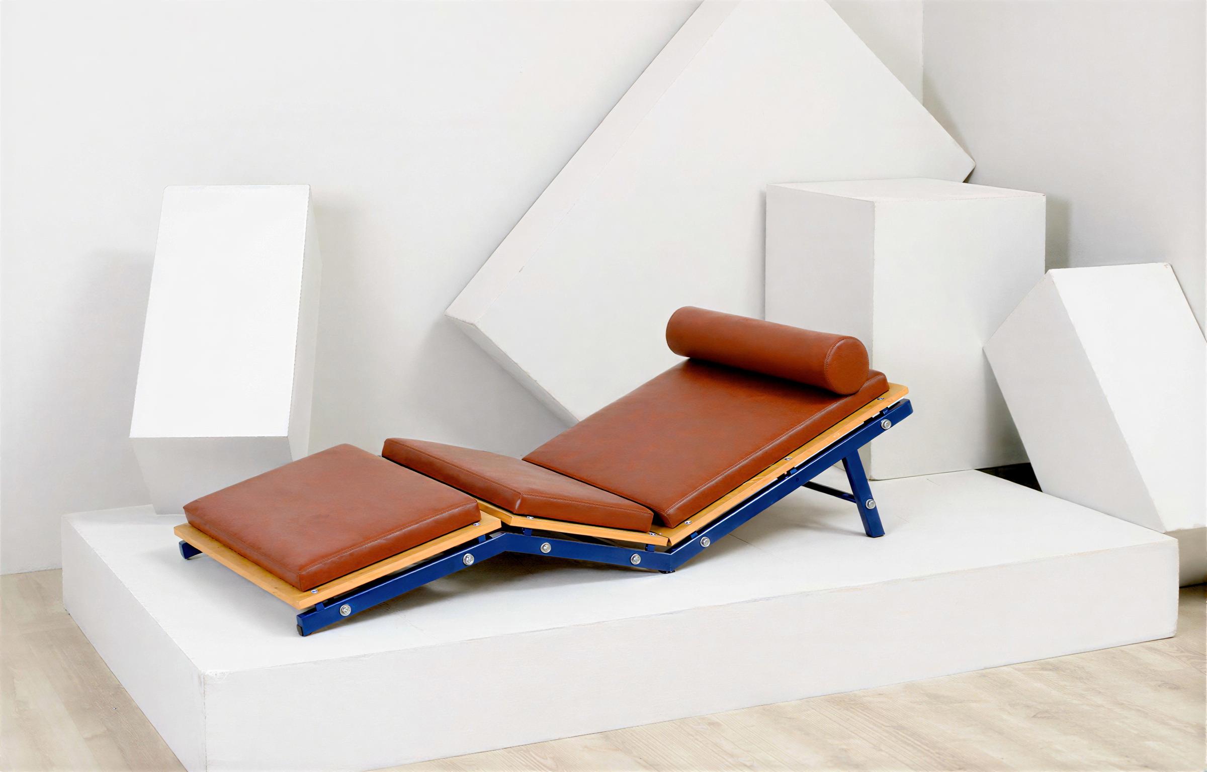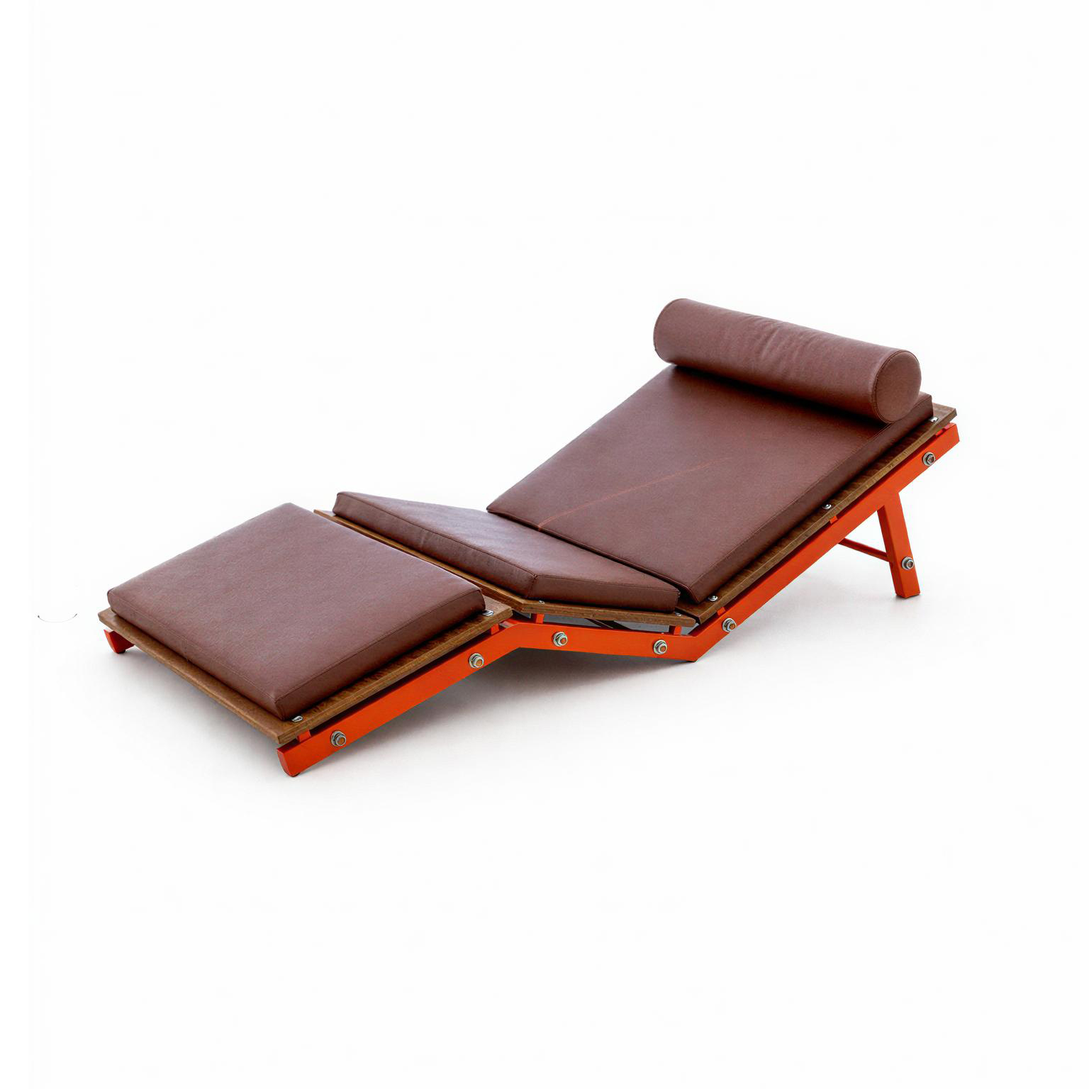 chaise-longue con struttura portante in tubolare metallico verniciato. Pannelli in legno. Finitura con cera d'api 100% naturale o laccati. Cuscino in cotone o ecopelle.