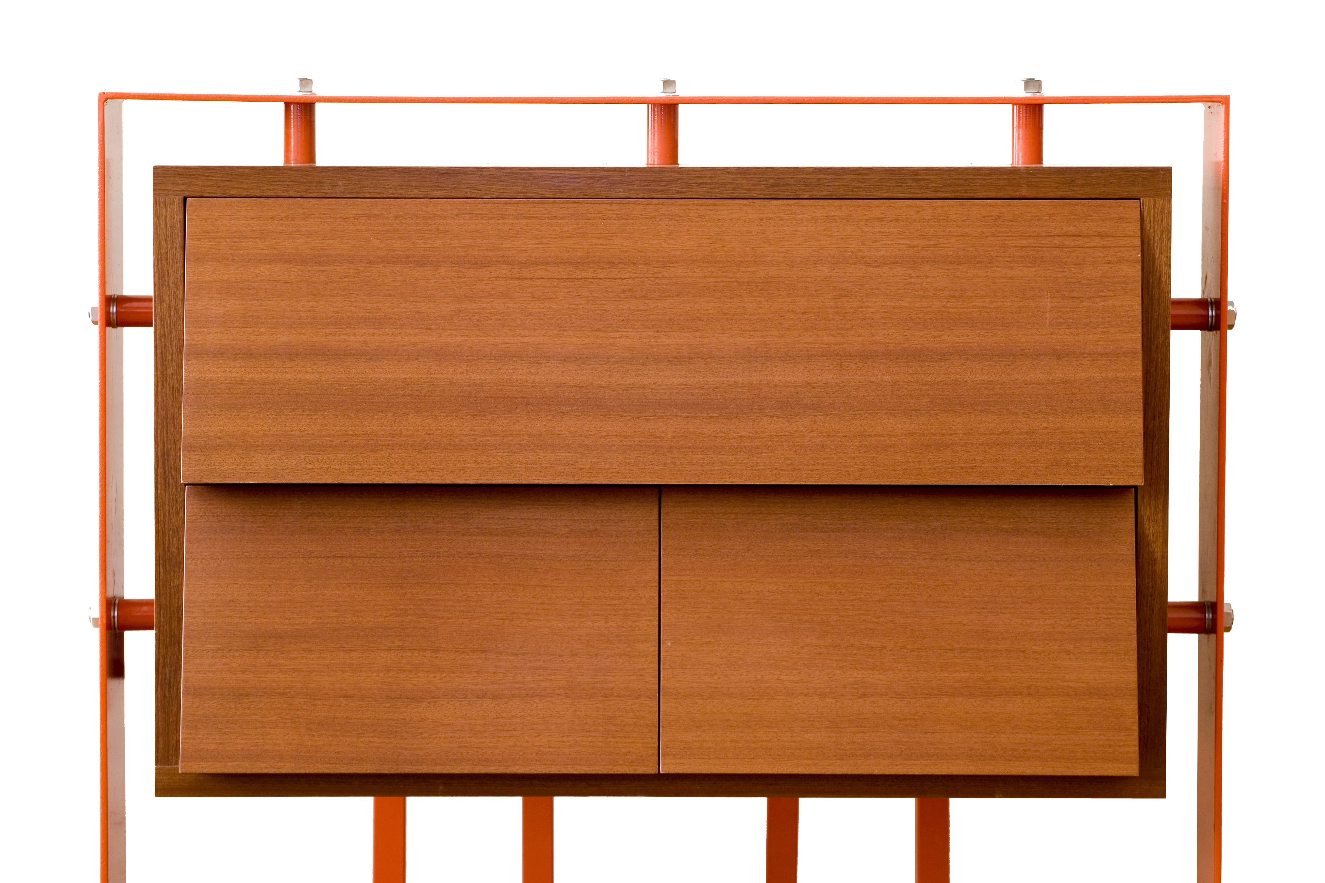 Cassettiera a tre cassetti con struttura portante in piatto e tubolare metallico verniciato. Mobile compatto in legno listellare. Finitura con cera d'api naturale al 100%.