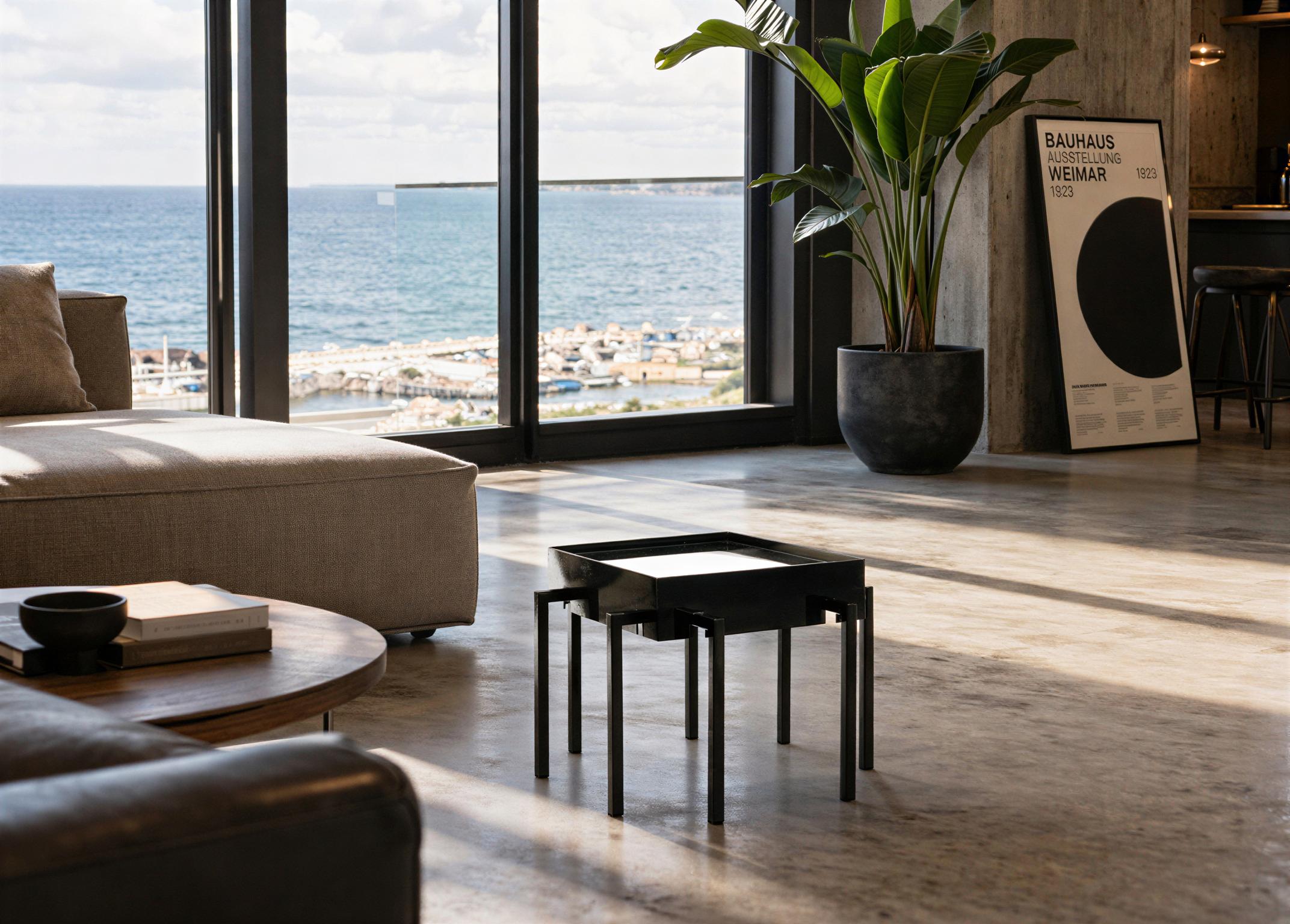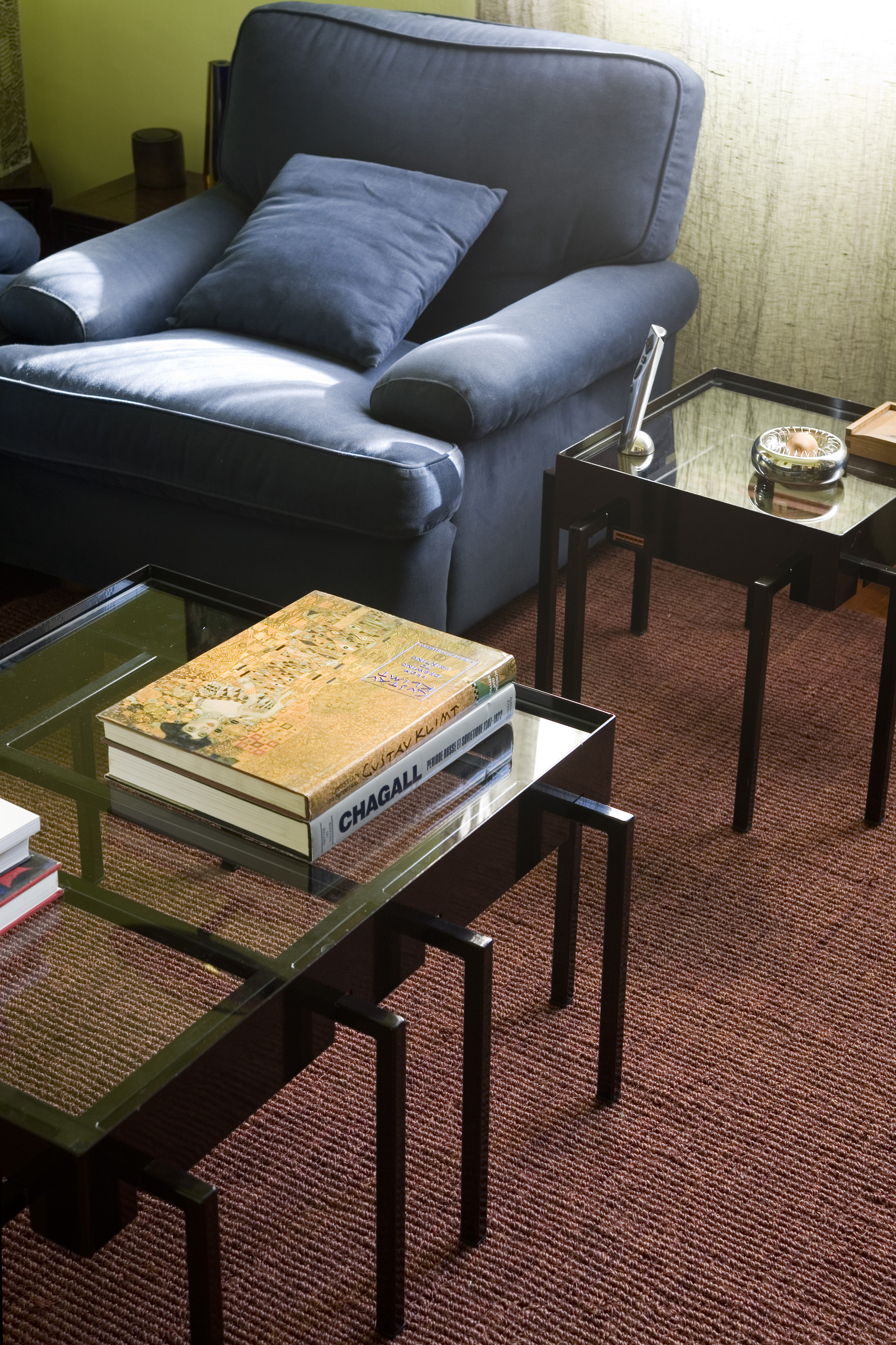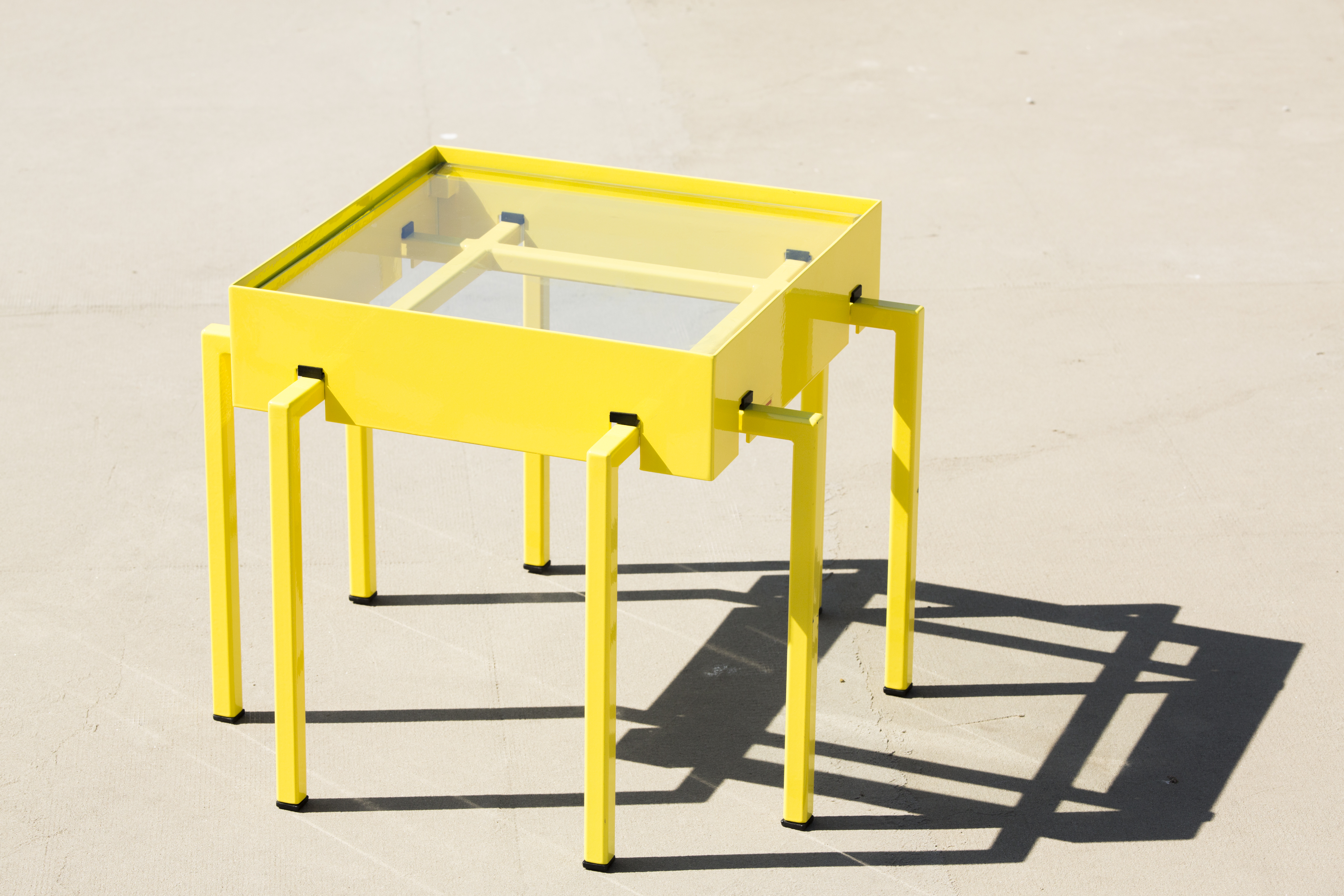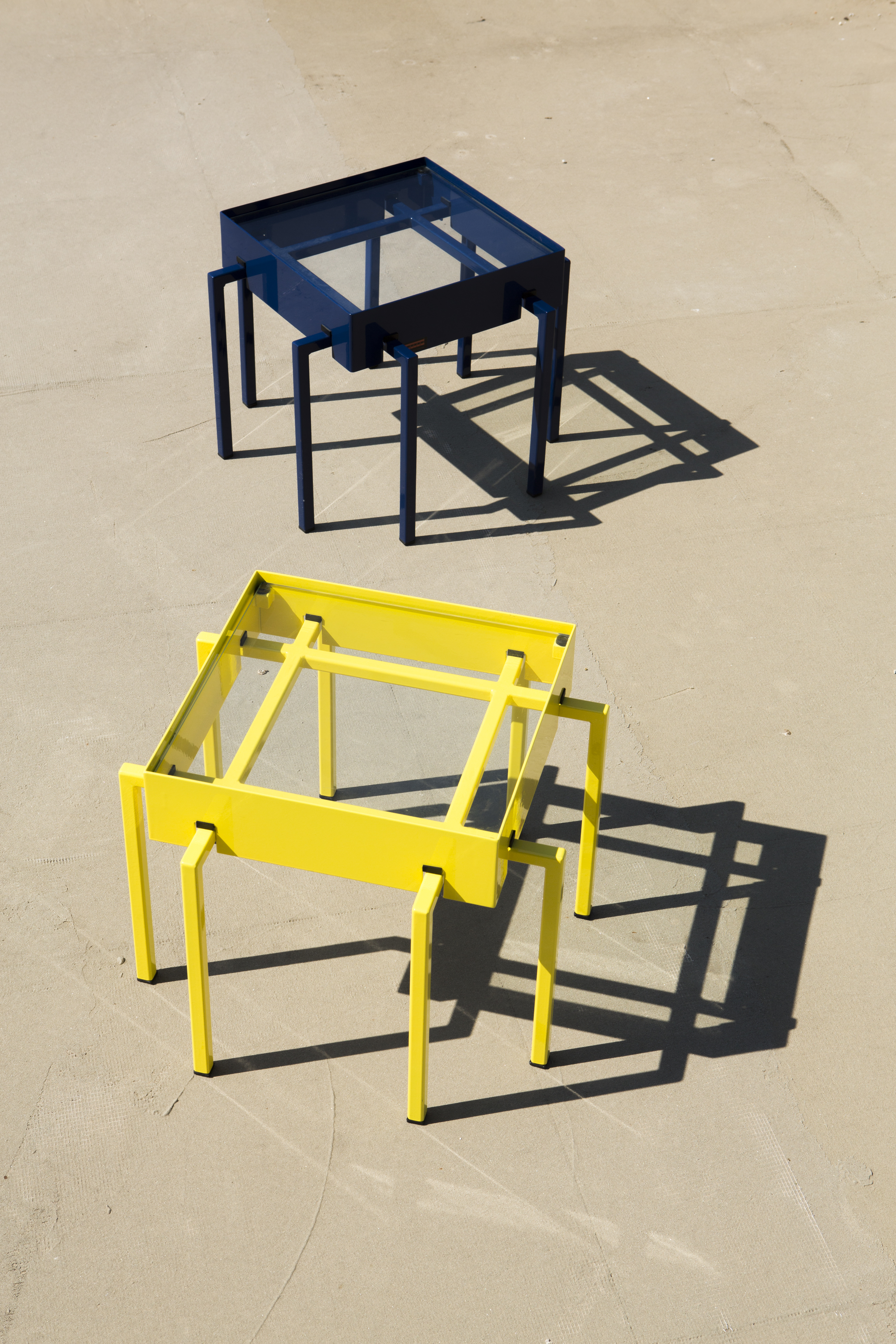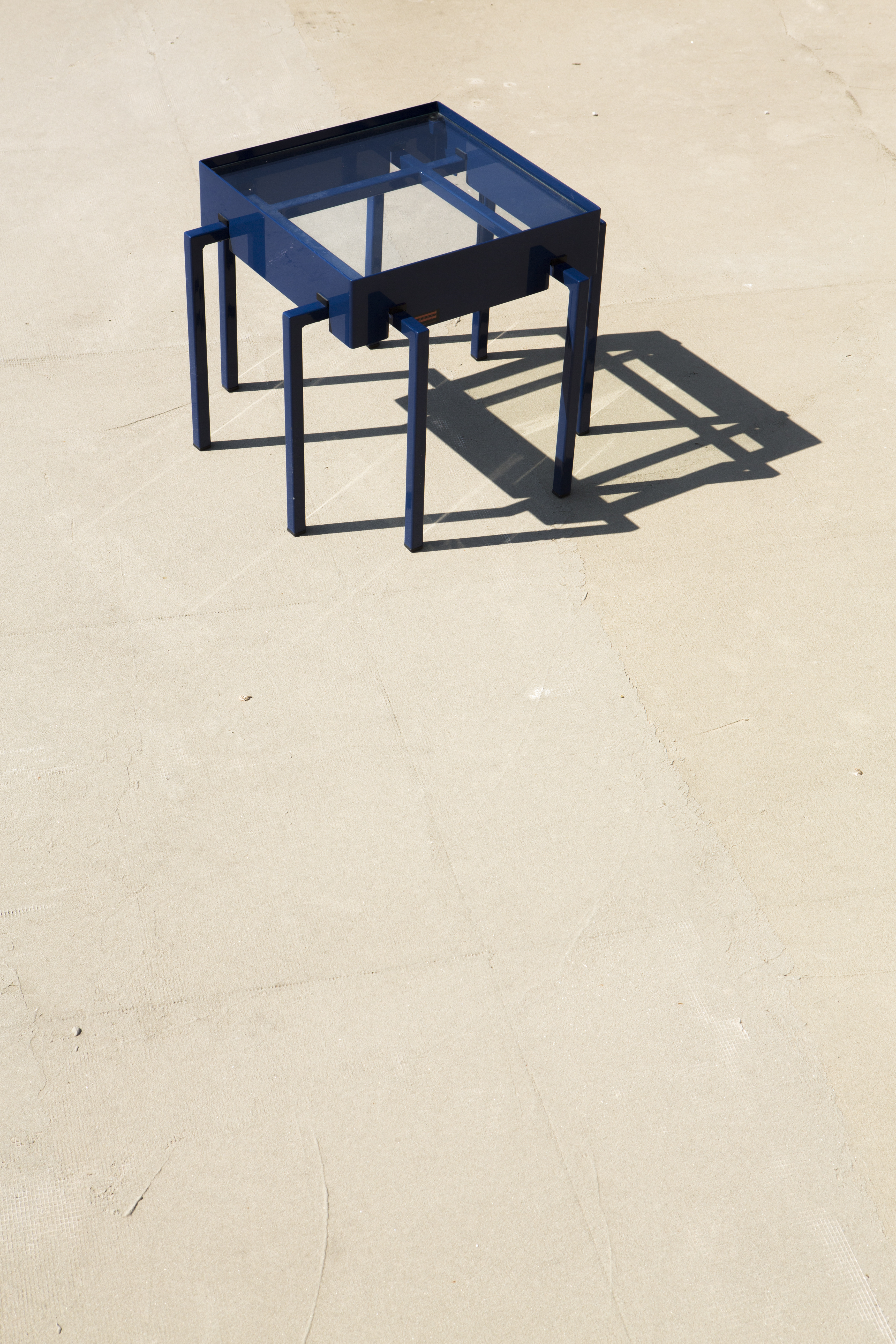 Tavolino con struttura portante in tubolare e piatto in metallo verniciato. Top in vetro temperato.