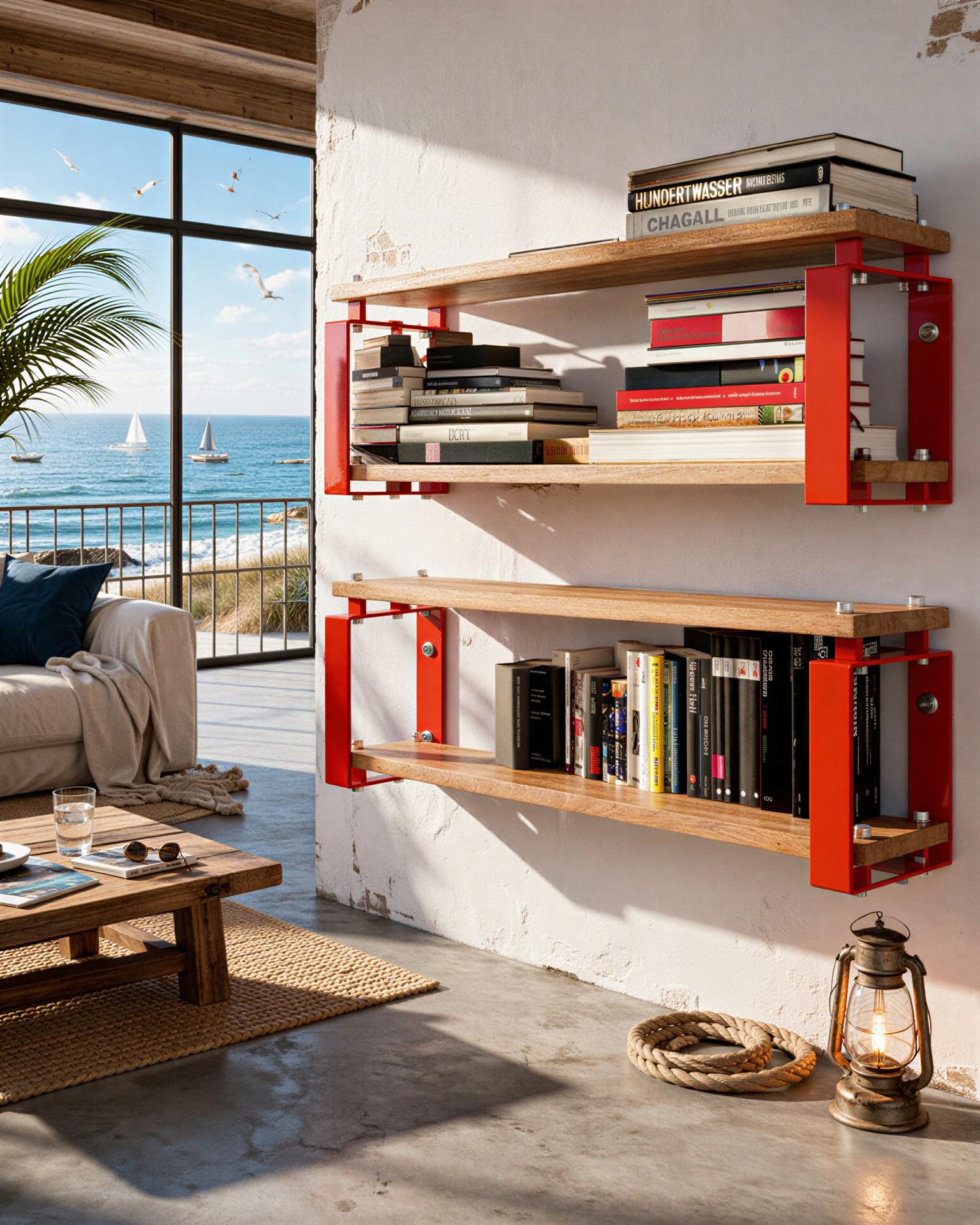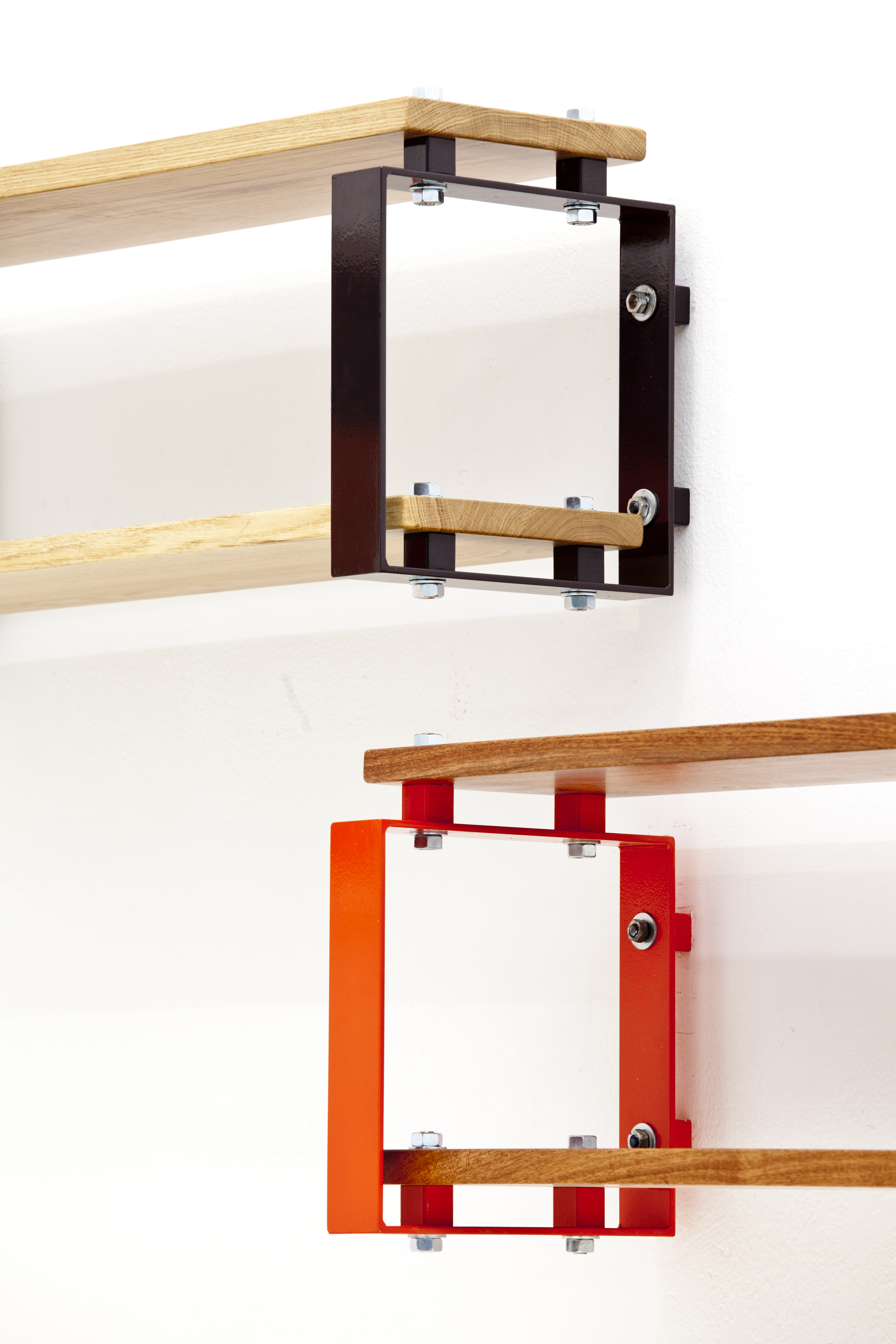 Struttura portante componibile in metallo verniciato con bulloni a vista. Ripiani in legno massello con finitura a cera naturale 100%.