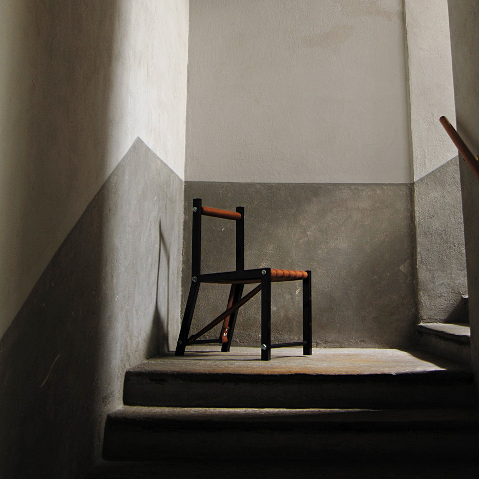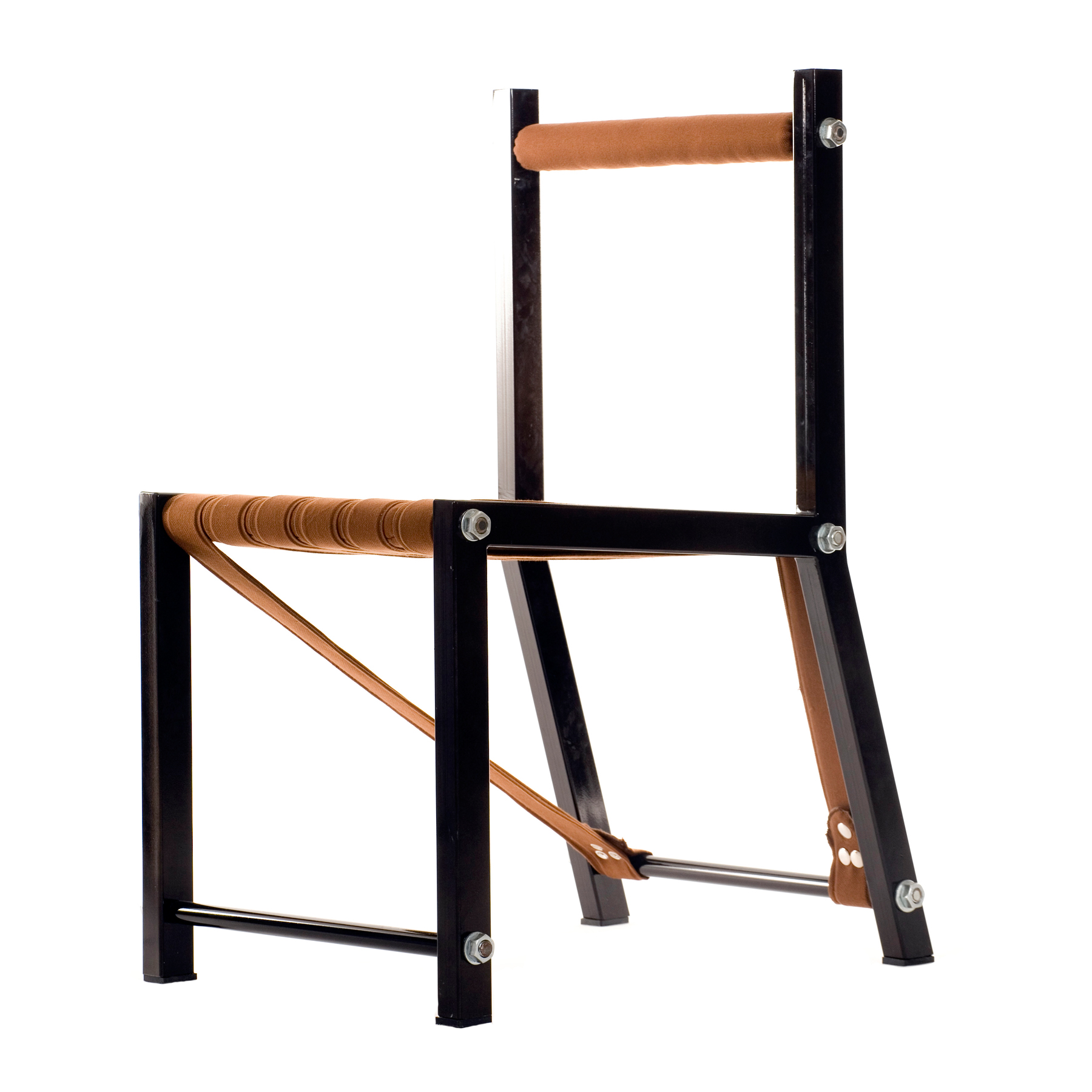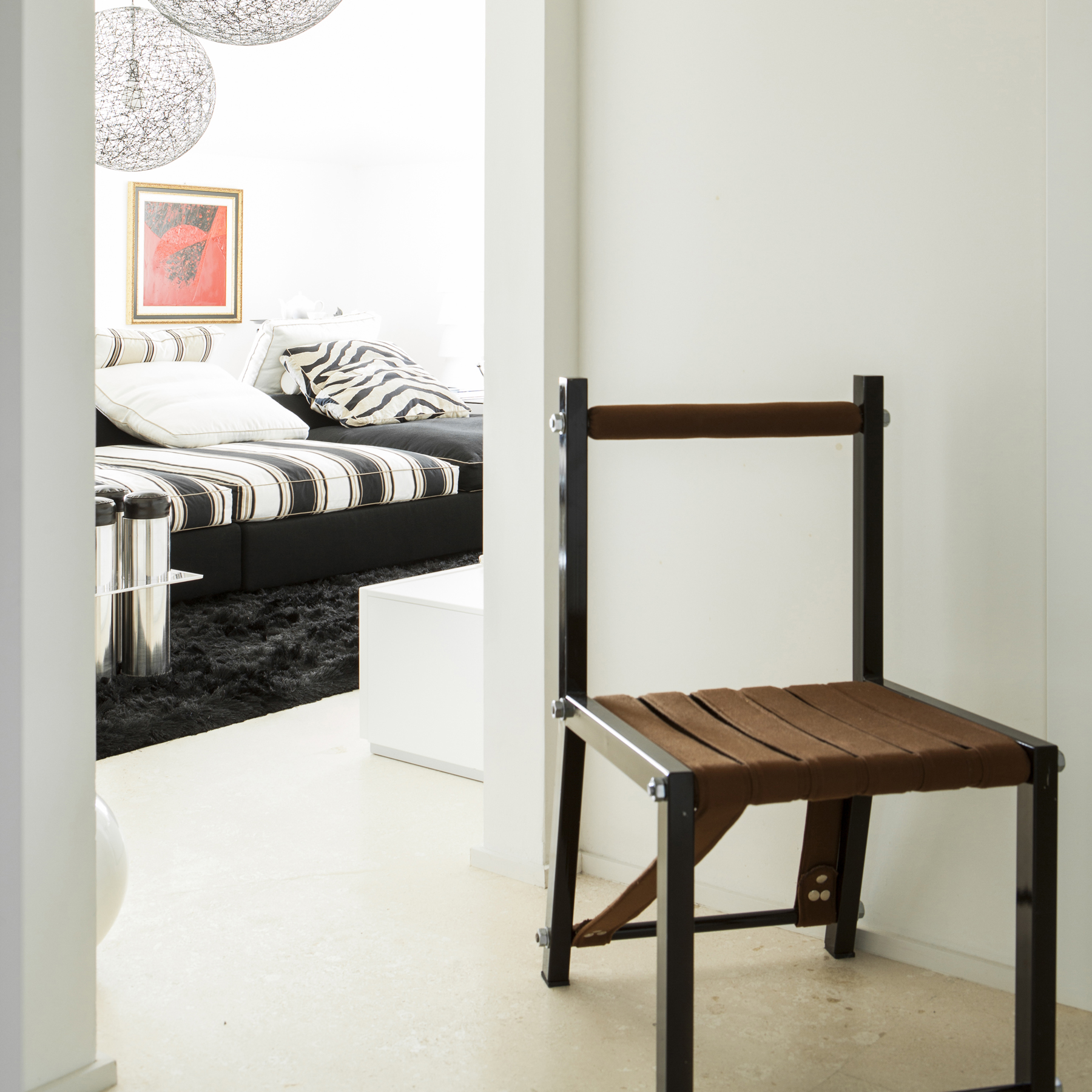 Sedia con struttura portante in tubolare metallico verniciato. Seduta in cuoio nero o cotone.