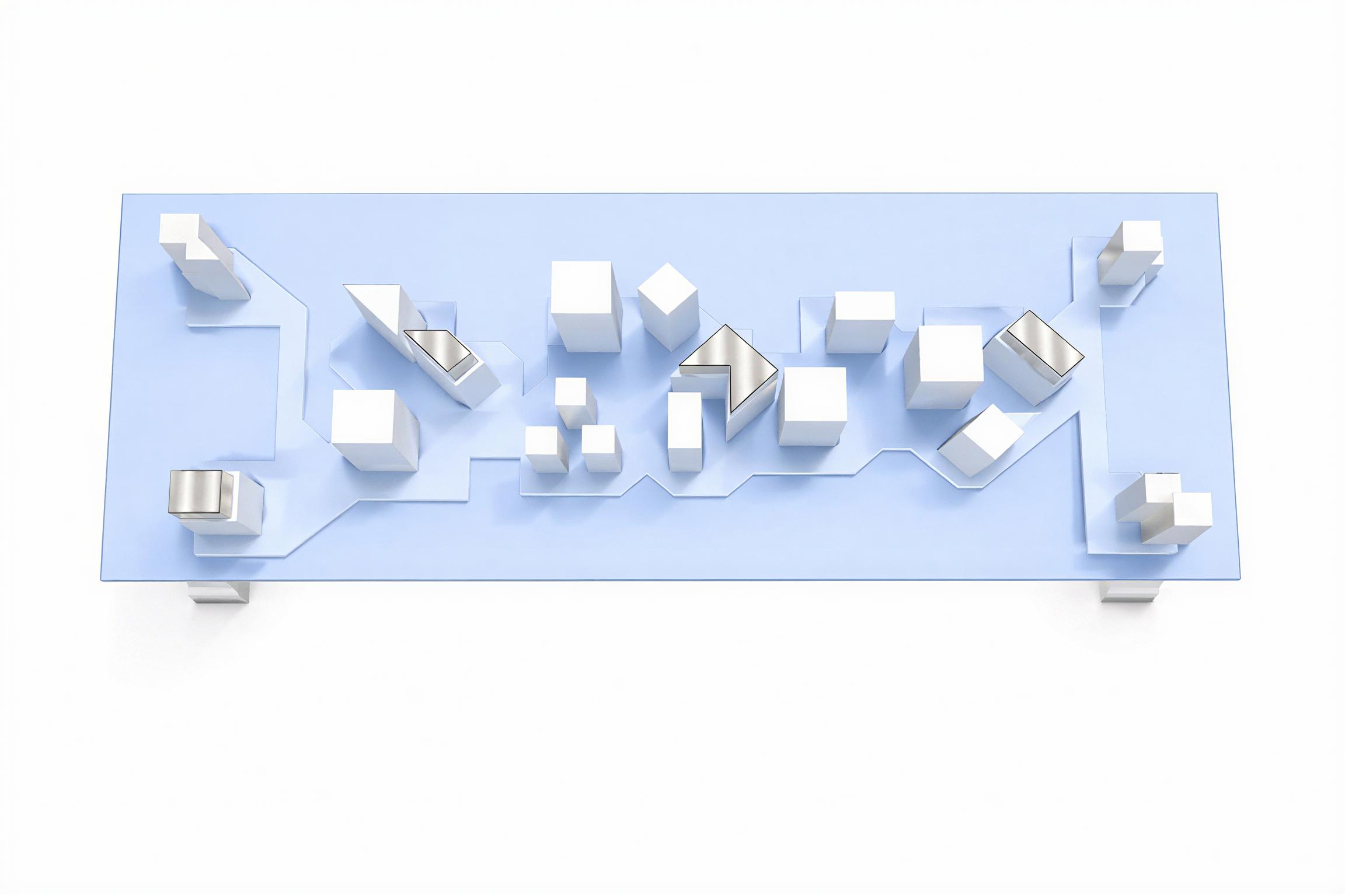 L’insieme genera un oggetto visivamente leggero ma concettualmente denso, una sorta di grafico architettonico tridimensionale.