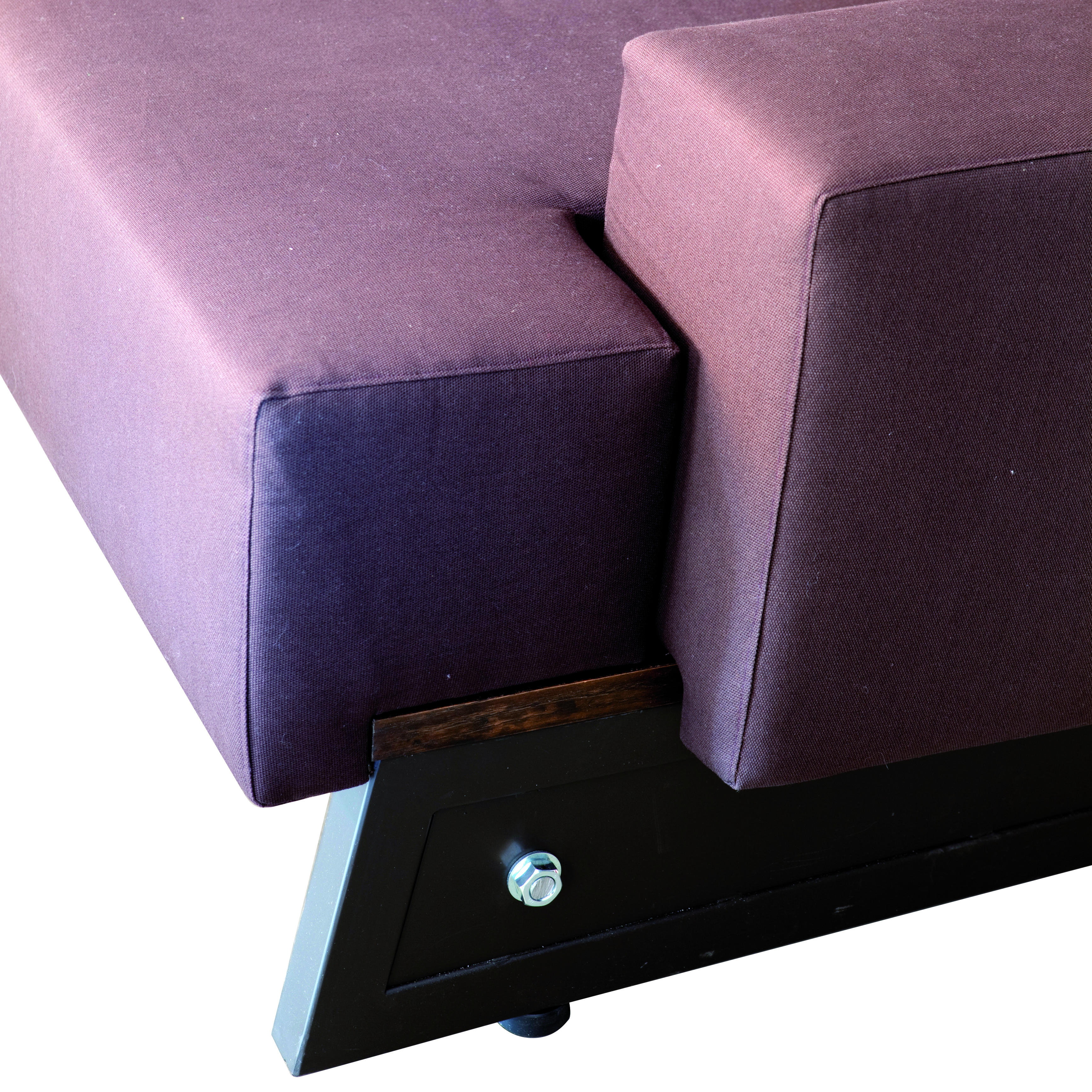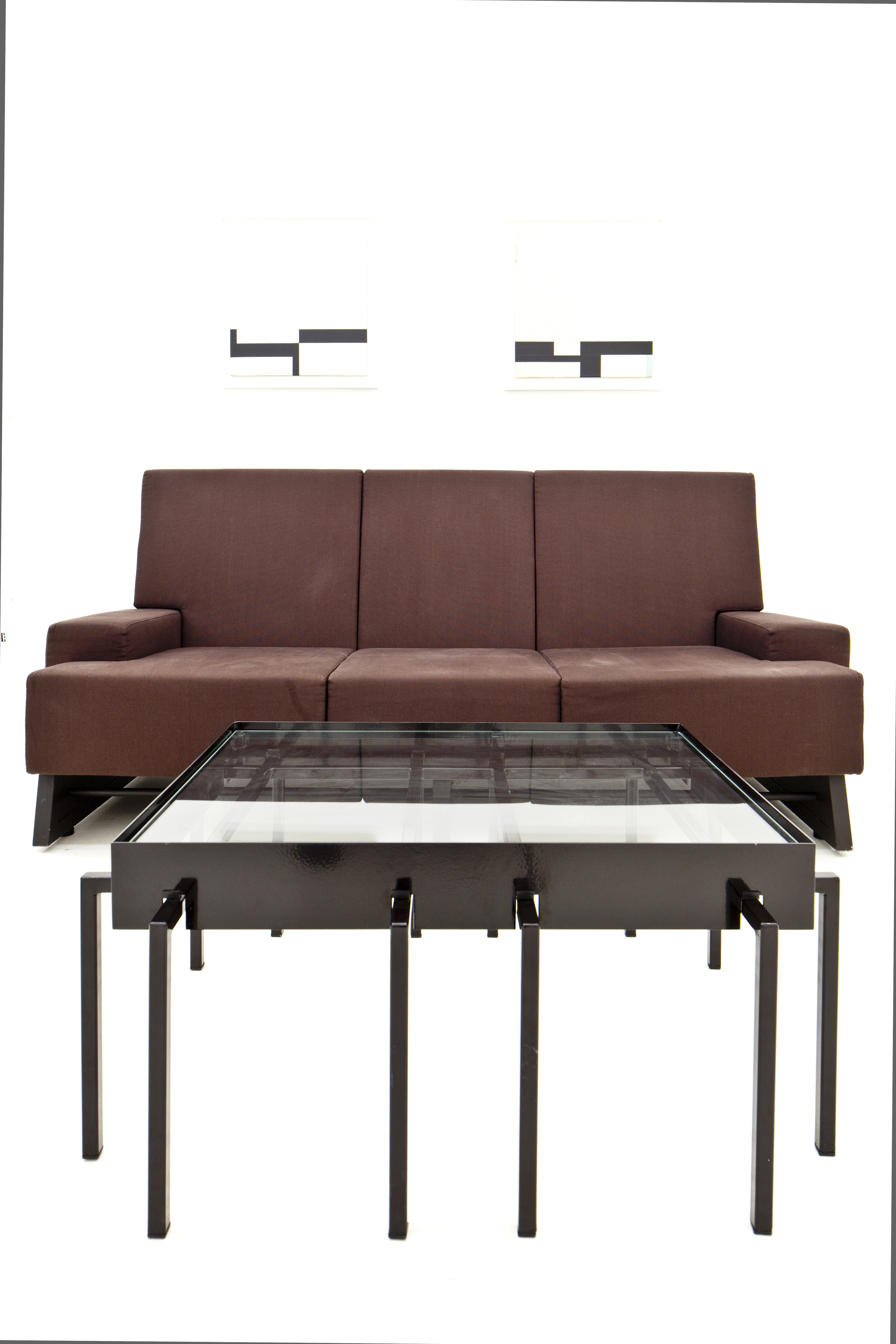 Divano a tre posti con struttura portante in tubolare e piatto di ferro verniciato e bulloni a vista. Finitura in pannelli in legno. Cuscini in poliuretano espanso flessibile rivestiti in stoffa di colore marrone.