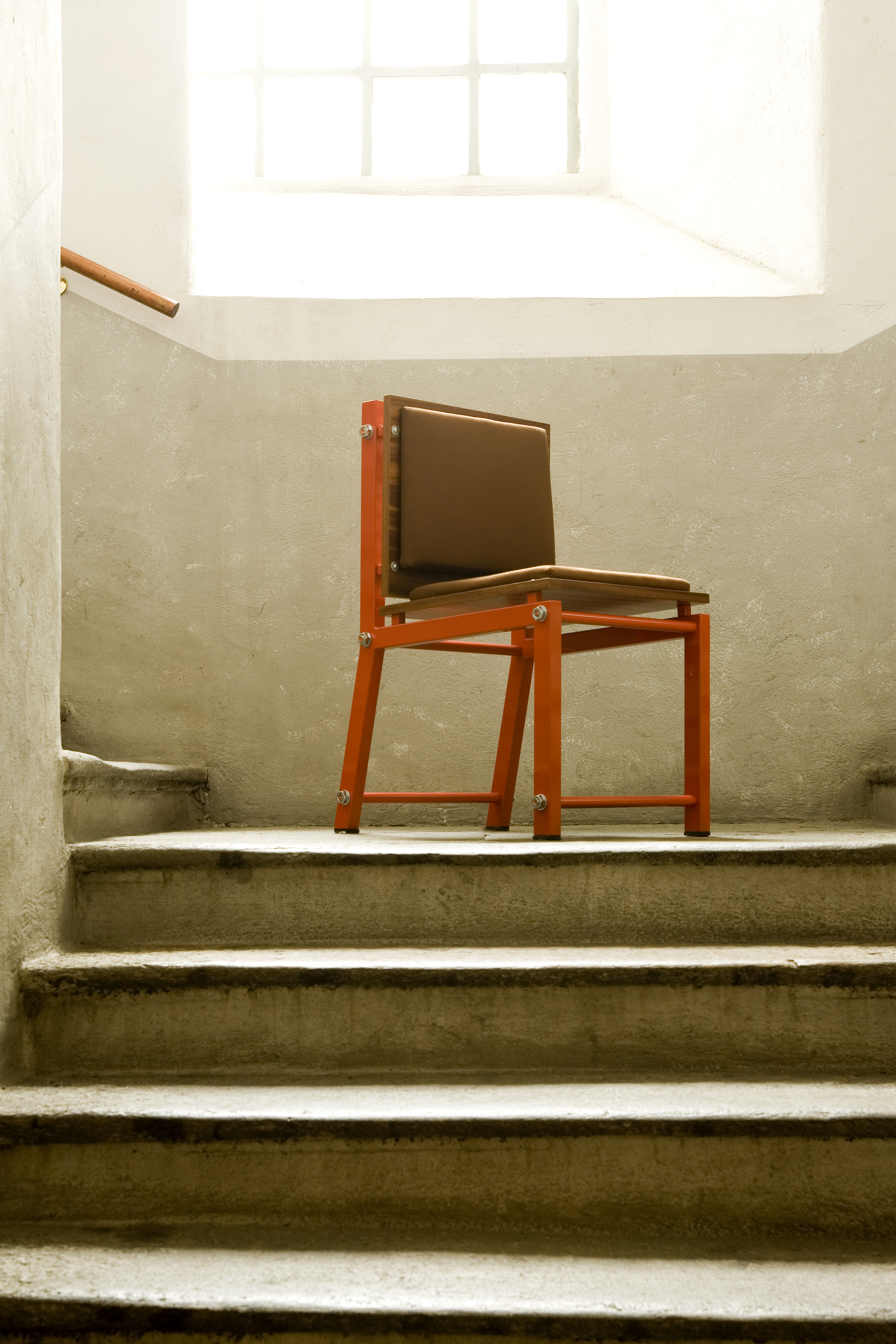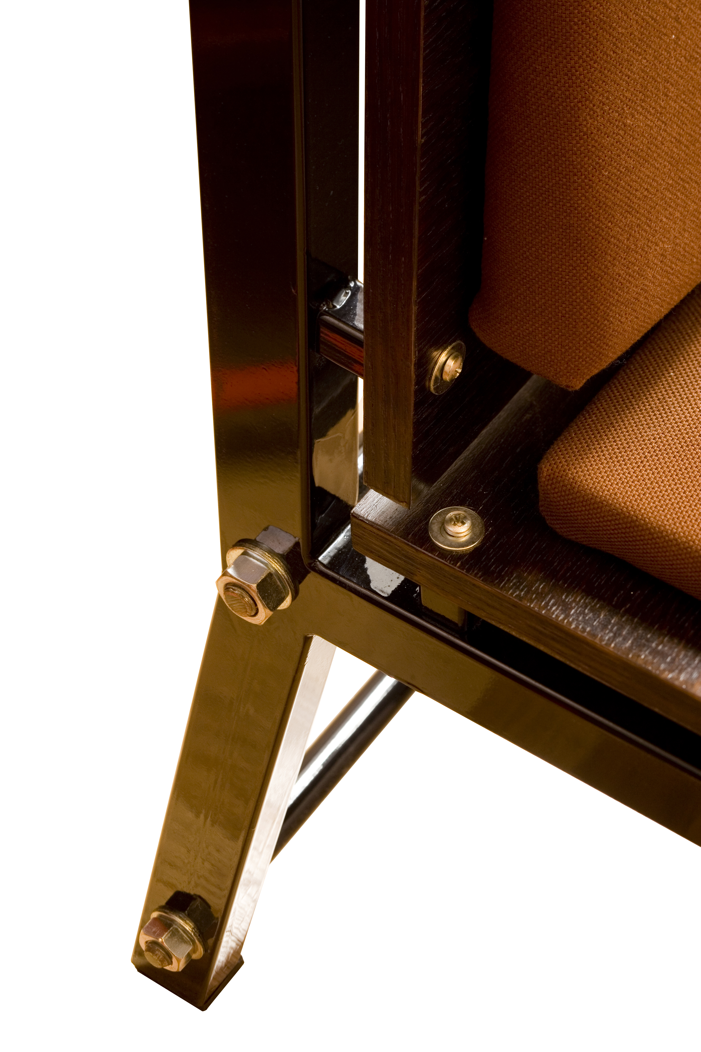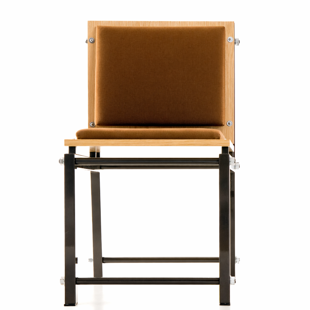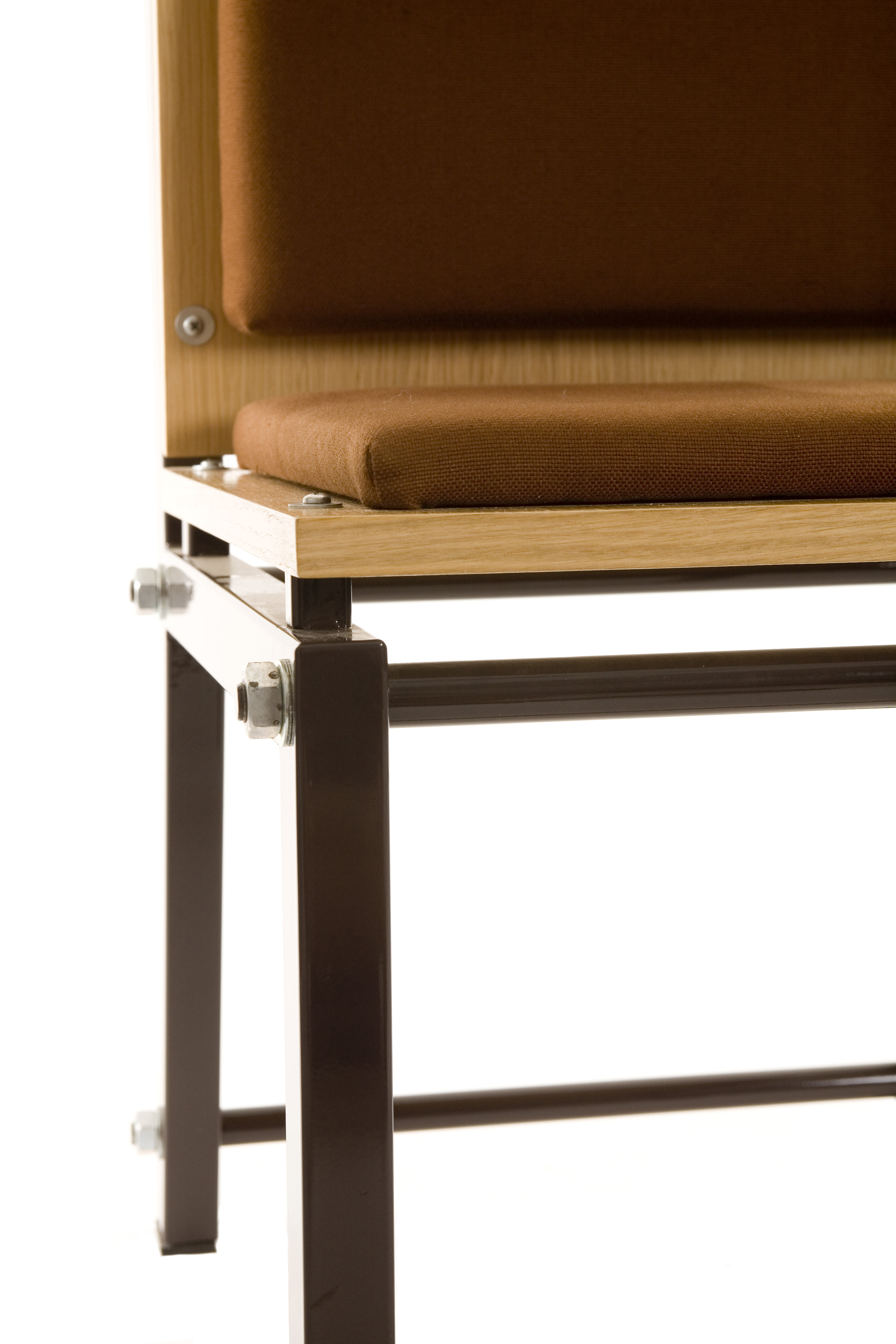 Sedia con struttura portante in tubolare metallico verniciato. Pannelli in legno listellare. Finitura a cera d'api 100% naturale. Cuscini in cotone.