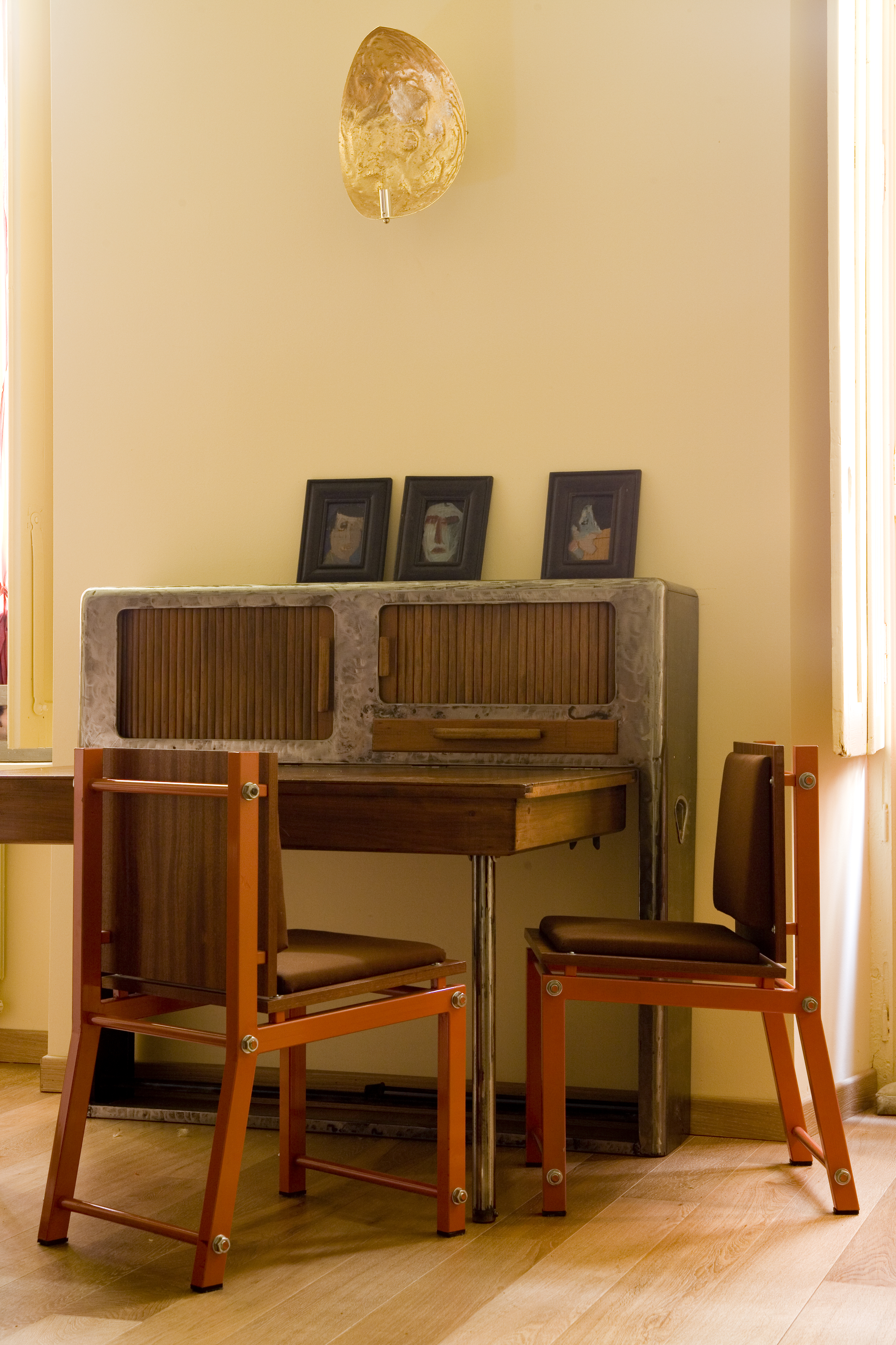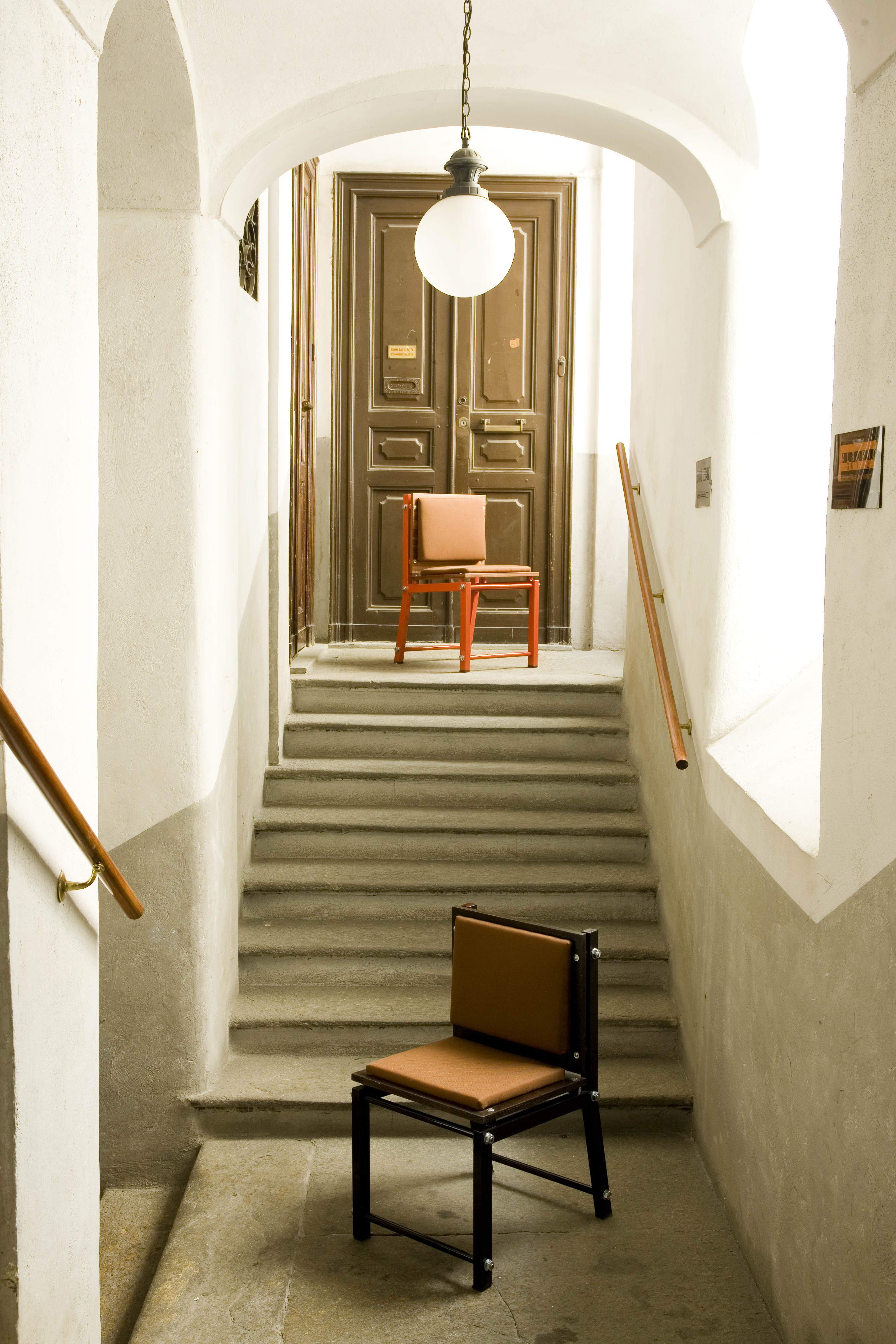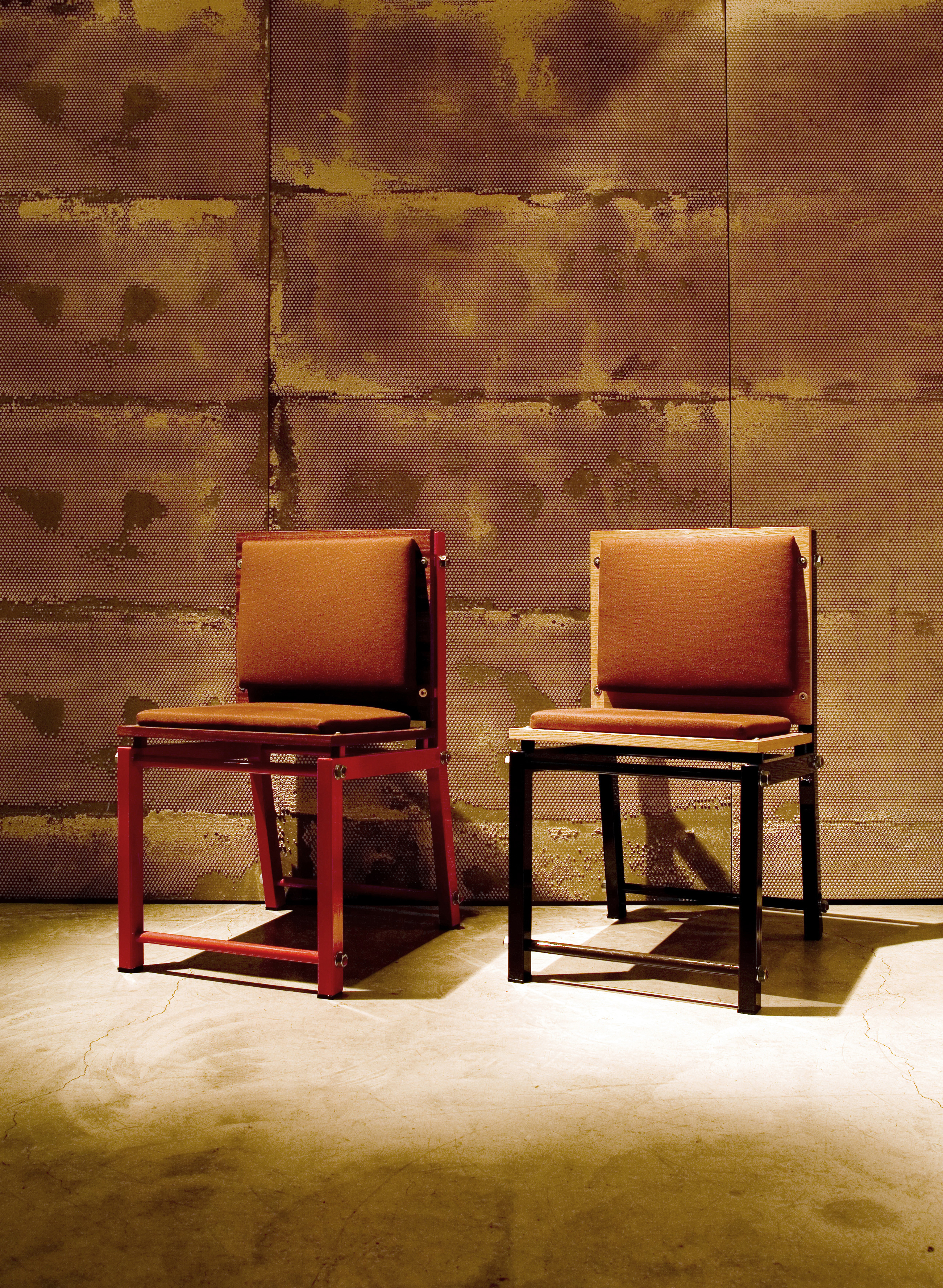 Sedia con struttura portante in tubolare metallico verniciato. Pannelli in legno listellare. Finitura a cera d'api 100% naturale. Cuscini in cotone.